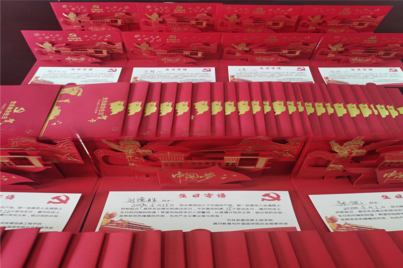 本网讯 为庆祝建党101周年,进一步深化党史学习教育成果,不断增强党员身份意识、宗旨意识和责任意识,6月30日下午,通识教育与外国语学院党总支在博雅楼N502会议室开展了“同过政治生日,共守入党初心”主题党日活动,此次活动由党总支副书记陈巧巧同志主持。对于普通人而言生日只有一个,而对于中国共产党党员来说,还有一个特殊的生日,那就是“政治生日”。从入党那天起,党员的政治生命随之开始,身上便肩负起了党和人民赋予的伟大责任和使命。 (政治生日贺卡)活动在《党旗飘扬的方向》悠扬歌声中拉开序幕,党总支副书记陈巧巧同志首先代表党总支向大家送上了诚挚的祝福,并对全体党员未来发展提出进一步要求,她希望大家继续不忘初心、牢记使命,坚定理想信念,牢记自己先锋模范的政治身份,始终保持政治使命感、组织归属感和身份荣誉感;同时为入党10周年以上的34位同志送上了党总支统一印制的“党员政治生日贺卡”,并进行拍照合影留念。 (收到贺卡的党员同志喜悦表情)随后,在陈巧巧同志带领下,党员们庄严地举起右手,以洪亮的声音