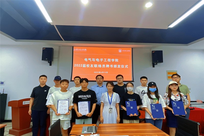为建立长期有效的校友联络机制,畅通校友与母校之间的沟通渠道,增进校友情谊,凝聚校友力量,促进校友工作的持续广泛开展,6月15日,电气与电子工程学院2022届校友联络员聘任仪式在A4S403会议室举行。电气与电子工程学院党总支书记、副院长陈振,学工秘书曹栋,毕业班辅导员许秋实、鲁孟,2022届各班级班长及团支书作为校友联络员参加了会议。(图为2022届校友联络员聘任仪式)会议伊始,陈振宣读了《安徽信息工程学院关于聘任2022届校友联络员的通知》,15名毕业生经过推荐遴选,获聘为2022届校友联络员。接着陈振为各位校友联络员颁发了聘书。会上,陈振对受聘的15名校友联络员表示祝贺并发表了讲话。他指出,校友联络员是联系校友与母校的桥梁与纽带,责任重大,使命光荣,希望此次受聘的校友联络员,要做好母校精神的传播者,秉承“立志、诚毅、创新”的校训,传承“自信自强、敢闯敢拼”的校风精神。切实履行好职责,积极推动学校的校友工作再上新台阶。随后,各位老师向全体新聘校友联络员顺利毕业表示祝贺,并对大家能够义务