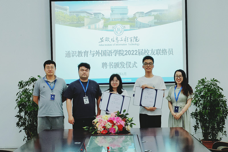 本网讯 为进一步加强学院与毕业生之间的联系,充分发挥校友作用,6月16日下午,通识教育与外国语学院于A1N502会议室举行2022届校友联络员聘任仪式。学院学工秘书华静、学院团总支书记涂遥以及2022届毕业班辅导员王丹为2022届的两名校友联络员颁发了聘任证书。仪式上,华静强调校友联络员是校友与母校的沟通桥梁,对校友联络员寄予殷切希望并提出要求,他希望校友联络员起好情感纽带作用,加强和班级同学之间的互联互通,不断挖掘优秀校友事迹,为学院、母校的建设发展献计献策,积极参加并组织校友活动,多多传递学校的声音。最后,他希望校友联络员能珍惜荣誉,勇挑重担,尽力服务好校友,秉承学院及学校优良传统,为母校发展添砖加瓦。图为聘书颁发仪式
