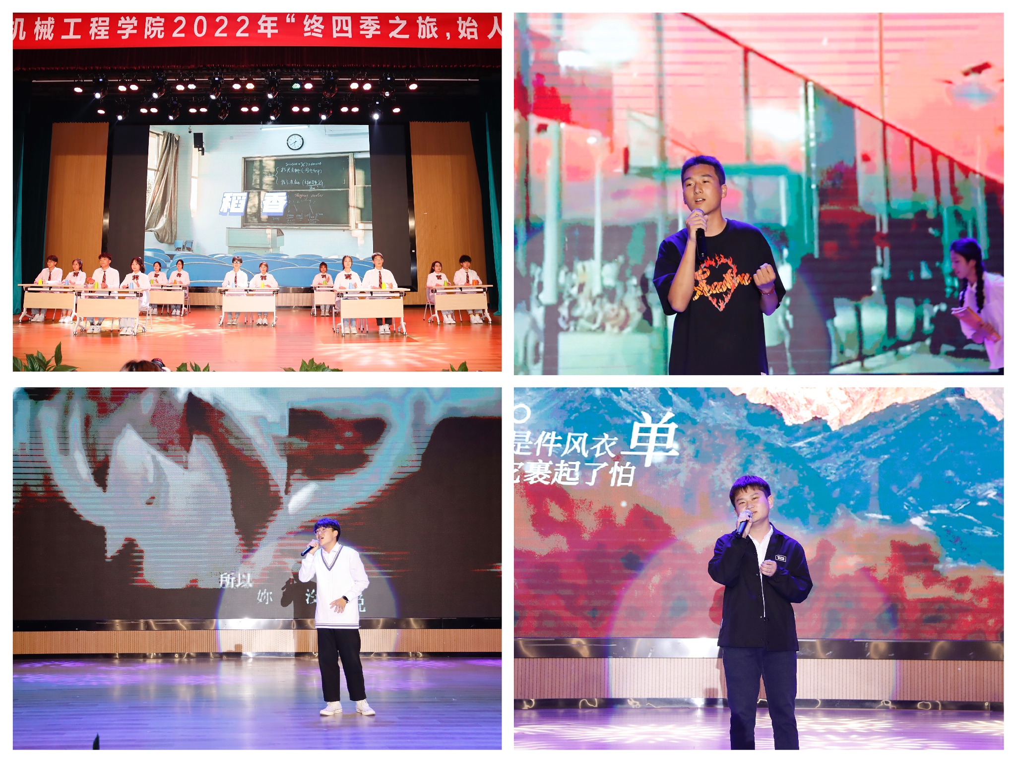 凤凰于飞,翙翙其羽。又是春光渐尽时,别离尽在咫尺间。初夏的夜晚,机械工程学院“终四季之旅,始人生征途”毕业晚会于5月27日19点在A32大学生活动中心拉开帷幕。机械工程学院院长柴阜桐、副院长柴知章、方传智、院长助理樊钒等院领导与老师们和毕业生们齐聚一堂,共同观看演出。晚会伊始,院长柴阜桐对毕业生们送出了美好的祝福,提到无论大家身处何地,即将踏上怎样的征程,都希望能够带上“立志、诚毅、创新”的烙印,在平凡的工作岗位上建功立业,时刻秉持与人为善、于己为善、与人有路、于己有退的处世之道。不断进取,鹏程万里!还记得初入校园的时候吗?还记得第一次上课的场景吗?开场的《稻香》将同学们带回从前,他们的故事也在那个秋天娓娓道来。《本草纲目+mojito+好想大声说爱你》用热情似火的舞姿,青春的激情和力量被完整地呈现了出来。《想自由》、《倔强》、《飞云之下》、《有点甜》、《一生所爱》以扣人心弦的歌声和悠扬动听的旋律,点燃了现场的氛围,为即将走向人生新征程的学子们展开了绚烂的画卷。(图为晚会现场) 伴随着毕