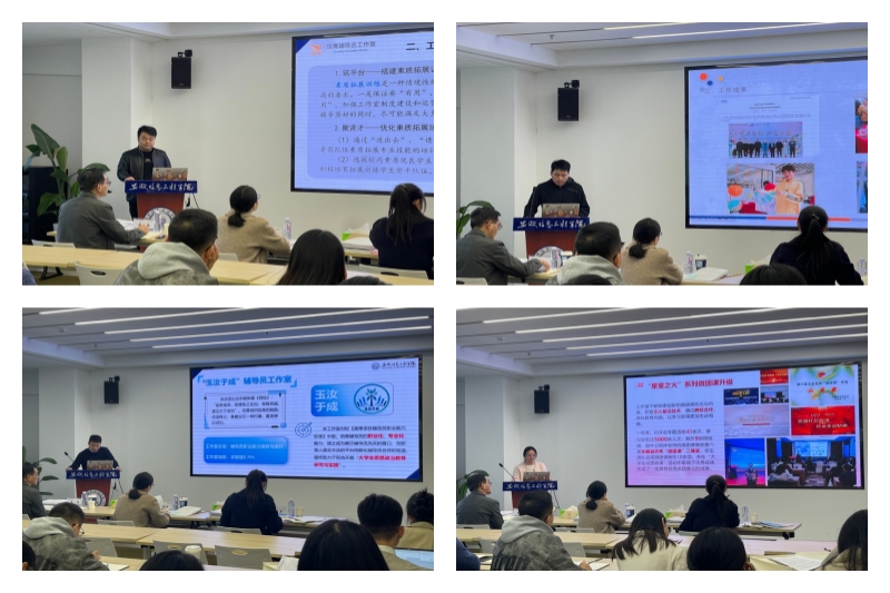本网讯 为推动学校辅导员工作室建设,11月13日下午,学生处(团委)在A32二楼1号会议室(N208)召开首批辅导员工作室结项验收及第二批辅导员工作室中期考核汇报会。副校长章敏凤、安徽工程大学学生处处长黄炜、安徽农业大学农学院副教授彭琼琼担任评委,各辅导员工作室主持人及成员参加会议。会上,八个辅导员工作室负责人依次汇报了建设思路、成果成效与未来规划,内容涵盖素质拓展、网络思政、学生干部培养等核心领域。各工作室立足学生成长与育人工作实际,通过探索差异化发展路径,形成了特色鲜明、务实高效的工作模式。(汇报现场)在专家点评环节,彭琼琼肯定了各工作室的创新实践与工作成效,指出工作室在辅导员能力提升与学生需求对接方面的突出亮点。同时,她也建议部分工作室要进一步聚焦定位、强化品牌意识,通过扩大成果覆盖、量化育人数据等方式,实现持续优化与提升。(彭琼琼点评)黄炜肯定了工作室立足本职的务实工作方向,建议通过在网络思政、学风建设、生涯规划等典型场景中打造标准化、可复制的模式,聚焦单一领域进行深耕,切实提升