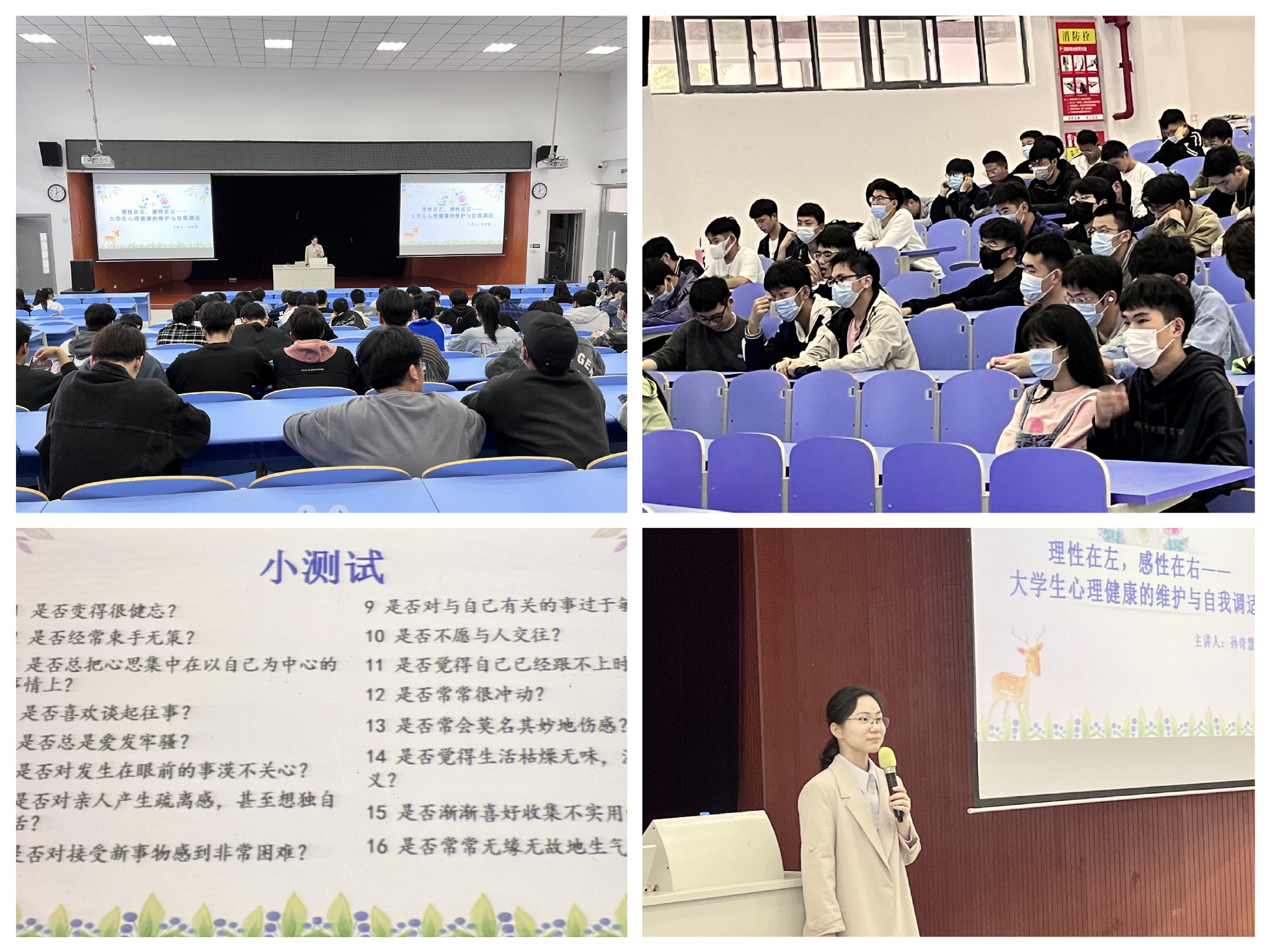 本网讯 针对当代大学生面临的学习、生活、就业等各种竞争压力问题,机械工程学院于5月11日下午在博文楼E101教室开展了以“大学生心理健康的维护与自我调适”为主题的讲座,孙奇慧老师担任主讲,近200名同学到场聆听。(讲座现场图)孙奇慧首先带领大家认识心理健康,用经典的心理学实验揭示心理健康与生理健康的辩证关系以及关注心理健康的重要意义。随后结合工作实际,总结当前大学生可能面临的几大主要心理健康问题及其诱因。接着她引用有趣的心理测试和生动的学生案例,重点讲述如何进行心理健康的维护和自我调节,浅显易懂的理论与易于操作的方法让同学们深受启发。最后,她鼓励同学们要积极地进行心理健康的维护,了解自己、接纳自己、发展自己、成就自己。创新的专业知识、完善的人格以及健康的心理是创新型人才的必备条件。希望同学们在学习专业知识的过程中,不断锻炼自己的心理素质,提升综合素养,成为全面发展的栋梁之材。