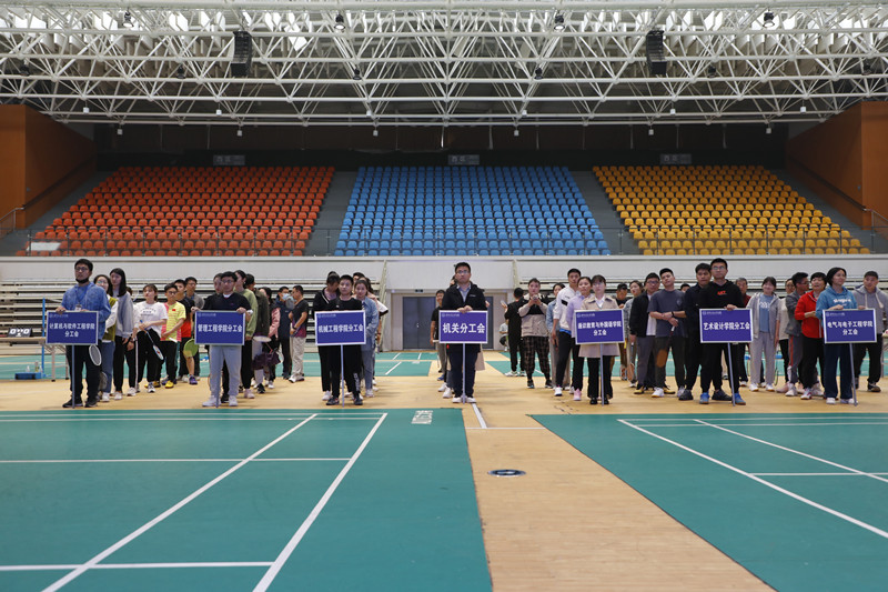 为进一步构建和谐校园,丰富我校教职工课余文体活动,加强教职工交流, 5月11日下午由校工会主办,通识教育与外国语学院分工会及羽毛球俱乐部承办的第二届教职工羽毛球联谊赛在体育馆激情开赛。此次比赛共有7支分工会代表队参赛,采取先小组循环淘汰后交叉竞技的赛制,每轮竞技分男单、女单、男双、女双、混双5个分项进行。(7支工会羽毛球代表队) 下午1点,羽毛球联谊赛在体育馆拉开帷幕,开幕仪式由通识分工会宣传委员华静主持。首先,校工会宣传委员陈巧巧宣读了整场比赛规则,其次通识学院体育教研室副主任张军骑、电气学院教师吴猛分别作为裁判员代表和运动员代表进行宣誓,最后,校工会文体委员陈振上台致辞,预祝活动取得圆满成功,并宣布比赛正式开始。比赛前,各队精心排兵布阵,积极热身;比赛中选手们热情洋溢、斗志昂扬,以精湛的球技、默契的配合展示了羽毛球运动的魅力,场上运动员们的精彩表现不时博得现场观众的热烈掌声。(羽毛球比赛现场)经过激烈的竞技角逐,最终,电气分工会获得联赛一等奖,计算机分工会、通识分工会获得联赛二等奖,