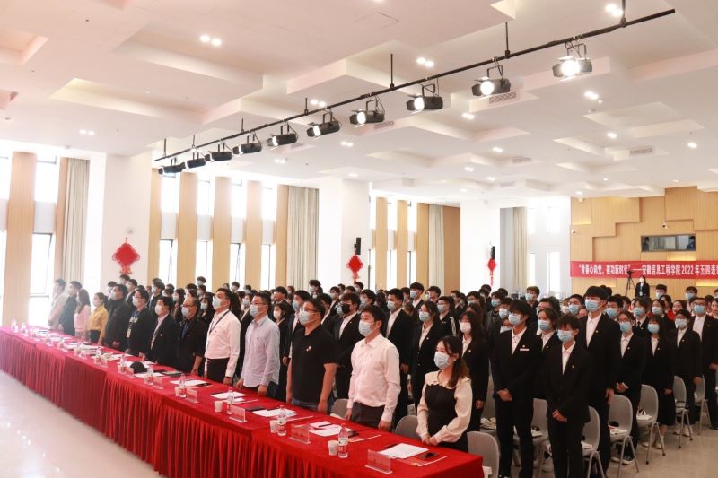 本网讯 在“五四”青年节到来之际,在全校深入学习贯彻习近平总书记考察中国人民大学时的重要讲话精神、深入开展“喜迎二十大、永远跟党走、奋进新征程”主题教育活动之时,为集中展现在青春赛道上奋力奔跑的安信工青年风貌,5月4日下午14时,学校“青春心向党 建功新时代”五四表彰大会暨新团员入团仪式在A32多功能报告厅隆重举行。校党委副书记、副校长葛付才,党委学工部部长、学生处处长吴晓,各学院分管中层、团总支书记、校团委全体老师及受表彰的师生代表参加了本次活动,大会由校团委副书记随小莉主持。(图为大会全体与会人员)本次大会分团课学习与新团员入团仪式、学校共青团2021年工作回顾与先进表彰、师生代表发言三个阶段。大会第一阶段在慷慨激昂的国歌声中拉开序幕。在观看团课学习视频后,陈振老师宣读2022年新发展团员名单,80名新团员在张凡同学的带领下面向团旗庄严宣誓,之后由老团员代表为新团员佩戴团徽并授予团员证。一枚团徽、一本团员证,蕴含着中华民族的历史厚重感和五四精神的青年责任感,深深地烙印在每一位新团员的