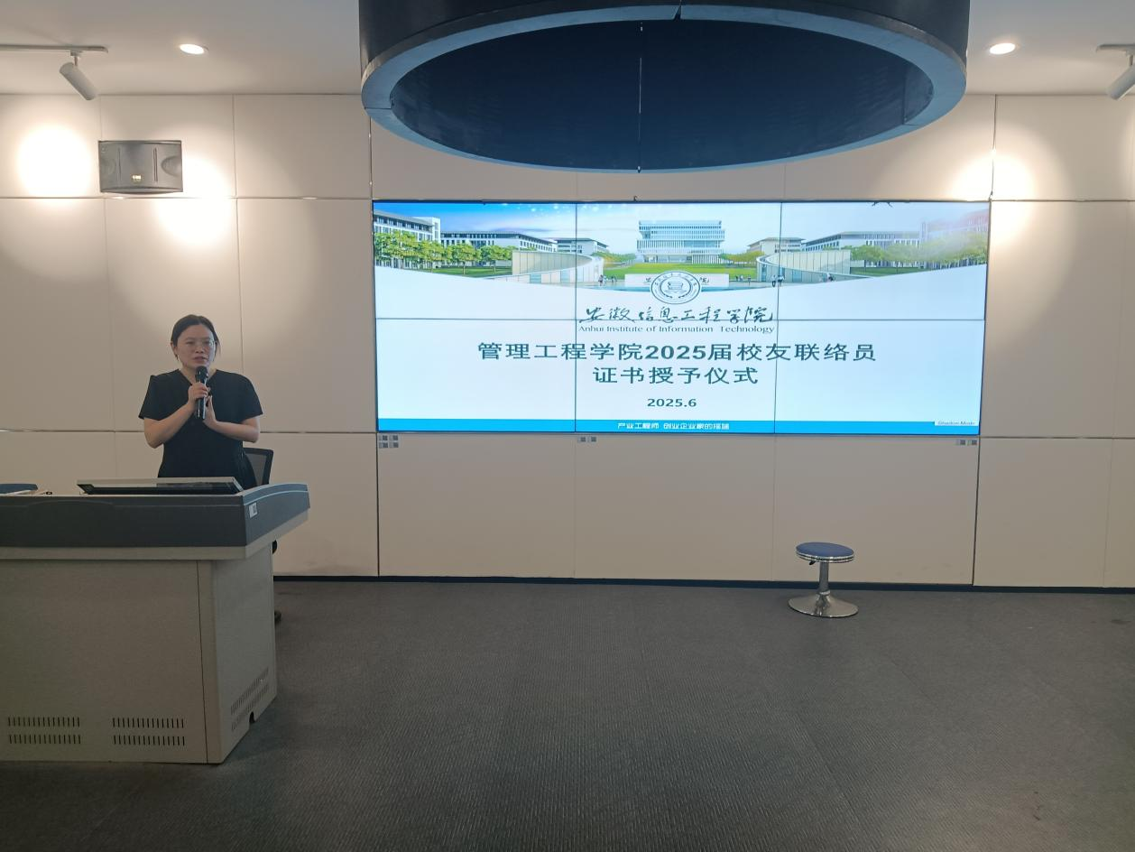 本网讯 为深化校友与母校的情感联结,构建长效发展共同体,管理工程学院2025届校友联络员证书授予仪式于6月18日下午在博行楼E401成功举办,活动邀请了管理工程学院副院长于凤,学工主管卫雨婷为校友联络员授予证书。活动开始,于凤详细阐述了校友联络员的工作职责与要求,清晰界定了他们所拥有的权利和应履行的义务。她殷切希望每一位校友联络员都能以满腔的热情、严谨的态度和高度的责任感,肩负起这一既光荣又重要的使命。作为连接母校与校友的关键桥梁,校友联络员们被寄予厚望,需主动加强与所在学院校友分会及学校校友会的联系,积极为母校与校友事业的蓬勃发展添砖加瓦,贡献自己的智慧与力量。(图为于凤讲话)随后,活动进入了庄重而温馨的环节——为校友联络员代表颁发聘书。这一聘书,不仅是对校友们能力的认可,更是对他们未来工作的信任与期待。接过聘书的校友联络员们,脸上洋溢着自豪与坚定,他们纷纷表示将不负所托,积极履行联络员的各项职责。(图为聘书颁发)展望未来,这些校友联络员将携手并进,以更加饱满的热情和更加务实的行动,为
