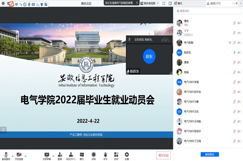 受新冠疫情、经济下行压力加大等多重因素影响,就业形势严峻复杂。为贯彻落实党中央、国务院关于高校毕业生就业工作的决策部署,加快健全高校毕业生市场化社会化的就业创业工作机制,创造出更多就业岗位和机会,深入落实就业工作“一把手”工程。电气与电子工程学院贯彻落实“全国高校书记校长访企拓岗促就业专项行动”,于2022年4月22日开展2022届毕业生就业动员会,副校长陈跃东,校长助理、电气与电子工程学院执行院长章敏凤,副院长陈振,毕业班各辅导员,2022届毕业生共一百余人参加会议,动员会由学工秘书曹栋主持。(图为就业动员会)就业动员会采用线上的方式展开,活动伊始,曹栋介绍开展本次动员会的意义,随后陈跃东指出本次动员会主要是为2022届毕业生进行开拓就业渠道和就业岗位,让其了解当今社会所需就业毕业生需求,鼓励在场的毕业生对现如今面临的就业问题提出自己的困惑,并为其进行答疑解惑。(图为陈跃东为同学们答疑解惑)同时此次动员会邀请优质企业蜂巢能源(盐城)企业为2022届毕业生做就业指导,蜂巢能源(盐城)企业