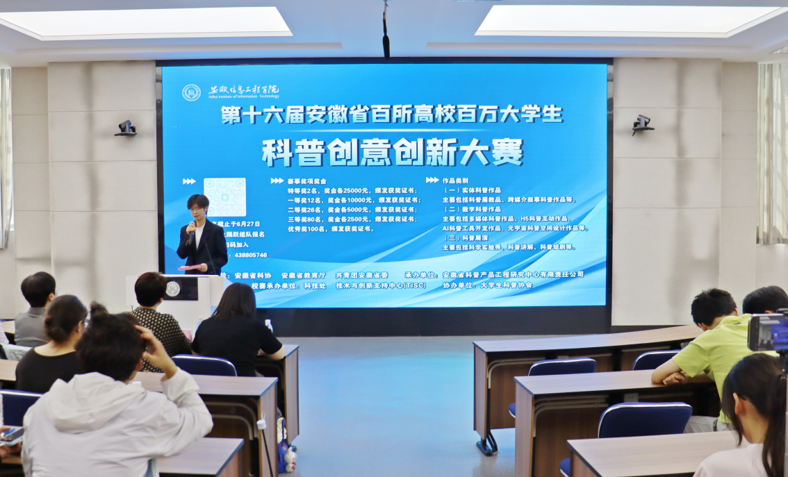 本网讯 为积极响应国家对科学普及与创新人才培养的号召,引导广大青年学子投身科学传播事业,增强创新创业能力,我校科技处联合技术与创新支持中心于2025年6月18日在A3W301成功举办了第十六届安徽省百所高校百万大学生科普创意创新大赛(下文称“双百大赛”)专家宣讲会。本次宣讲会特邀请到京皖科技传播与教育智库负责人、研究馆员何丹,科普产品国家地方联合工程研究中心副主任、安徽省科普文化产业协会常务理事、副秘书长夏莹担任主讲嘉宾,全校共有140余名学生参加,现场气氛热烈。 (图片为双百大赛宣讲会现场)本届双百大赛在赛程安排、作品分类体系、评分细则标准等方面进行系统性优化升级,力求赛事更科学合理。宣讲会开始,何丹博士强调,科普作品不仅要准确传达科学知识,更要以新颖有趣的形式吸引观众,激发大众对科学的兴趣。同时,鼓励同学们充分发挥自身专业特长,紧密结合社会需求,将创意巧妙地融入到科学知识的传播中,创作出具有广泛影响力的科普作品。 (何丹宣讲)随后,夏莹围绕双百大赛,从赛事背景、大赛优化调整、比赛规