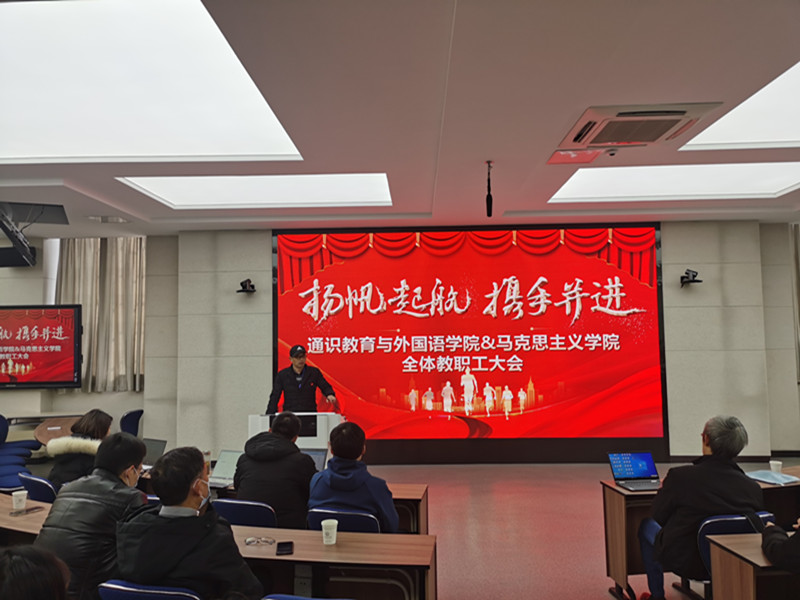 牛辞胜岁,虎跃新程。1月16日下午,通识教育与外国语学院(马克思主义学院)在博学楼W301召开了2021年度全体教职工大会,共同盘点2021年学院各项工作取得的新进步、新突破、新亮点,并就不足之处进行了梳理和反思。副校长王彬、学院领导班子成员和全体教职员工参加了会议,会议由执行院长刘德胜主持。会上,刘德胜全面总结了2021年学院中心工作的完成情况。他提出,2021年学院坚持以立德树人为根本,以特色发展、质量提升为主线,突出智慧教学、师资队伍建设、教学规范建设、班风学风建设、重点改革项目,以目标考核为抓手,固本强基,提质培优,增值赋能,各项工作取得优异成绩,教学改革得到大力推进,师资队伍建设成效显著。同时剖析了工作中存在的问题和下学期主要工作思路,重点对2022年春季学期的各项工作和学期末收尾工作作出周密部署,提出明确要求。(图为刘德胜发言)副院长胡叶婷对老师们一年来对学校工作的努力与付出表示了感谢。她提出,2021年是不平凡的一年,全院上下众志成城,凝心聚力保证了各项工作的顺利开展,下一