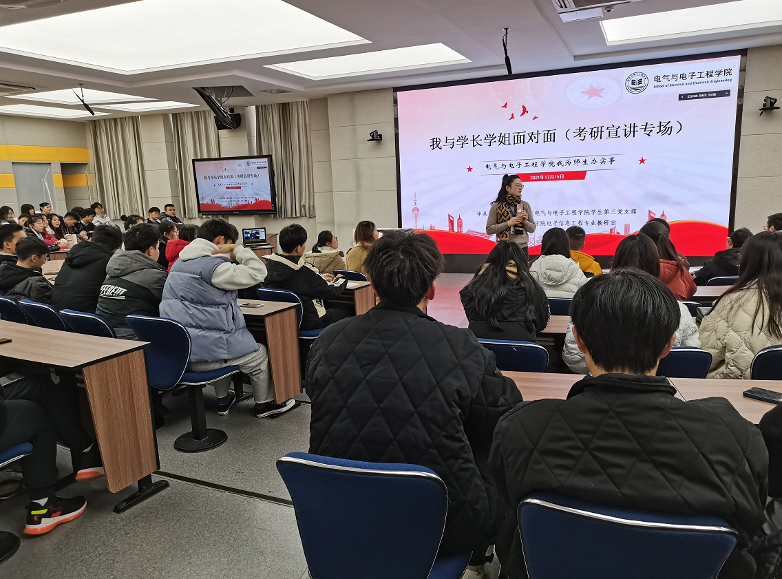 为进一步调动学生考研积极性,解决大三学生当下考研方向不明确和考研选择不清晰等问题,电气与电子工程学院专业教研室和学生第三党支部于2021年12月15日下午组织了“我与学长学姐面对面”的考研动员活动,参加活动的有各教研室代表老师、电信19级全体学生、其他专业有考研意向学生、辅导员代表王欣桐等,南京邮电大学的张俊、浙江理工大学的吴涵、南昌航空大学的常晴晴、安徽工程大学的王晶作为特邀学长学姐,根据自身考研经历分享经验、与考研学生进行交流互动,为准备考研学生指点迷津,减少考研迷惘的现状,提升我院本科毕业生质量。