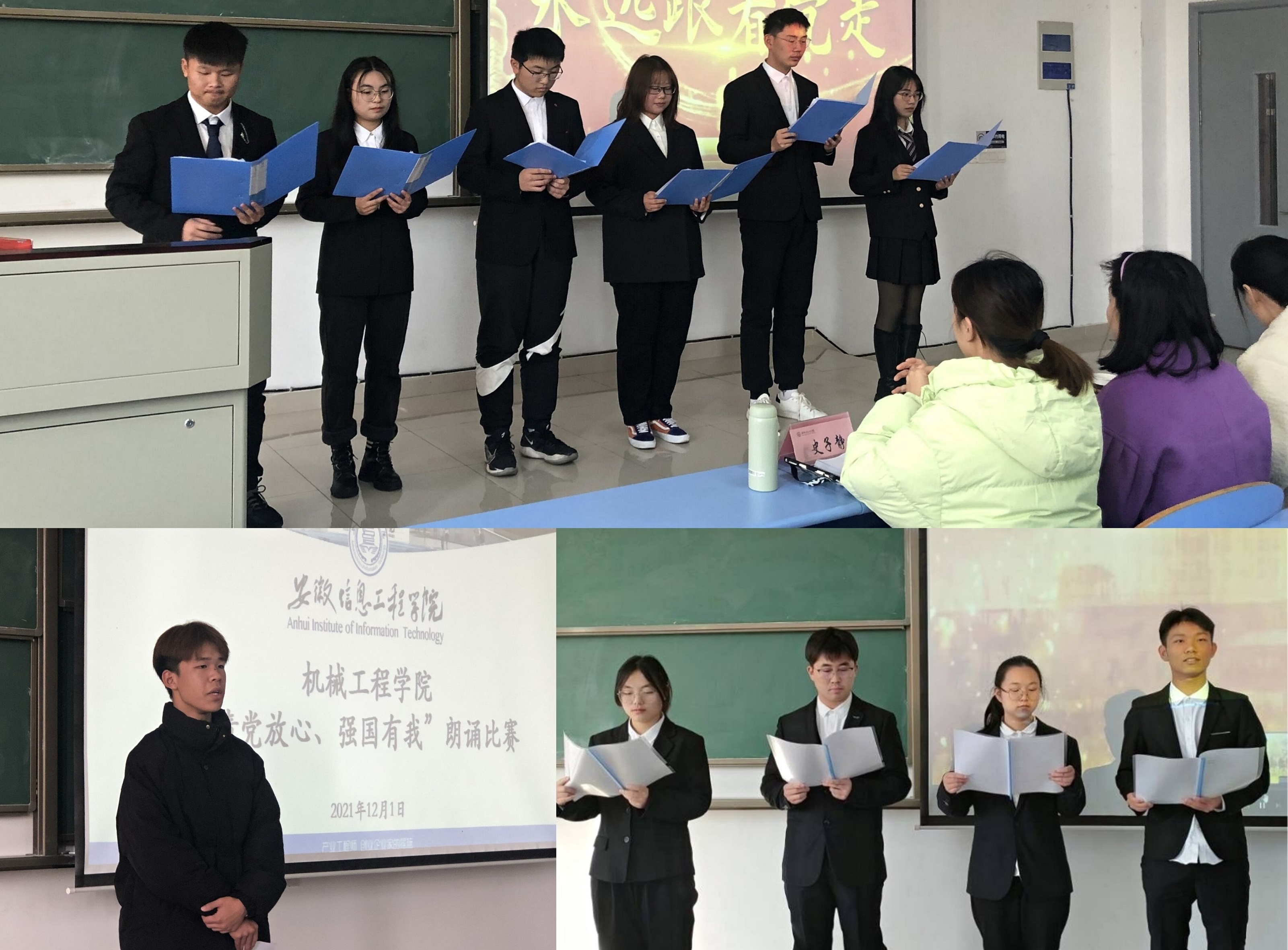 本网讯 为推动党史学习教育全面深入开展,引导广大学生厚植爱党、爱国、爱社会主义的情感,展现青年学子良好的精神风貌和时代风采,进一步提升大学生的语言能力和人文素养,营造积极向上的校园文化氛围,12月1日下午2点,机械工程学院于博学楼W202教室举办了“请党放心,强国有我”朗诵比赛。学院史子静、周倩文、查璇老师出席并担任评委。《请党放心,强国有我》《党旗下》《觉醒年代》《党的光辉照我心》等经典或原创篇目朗诵都十分的精彩,一句句激情澎湃的话语,一声声声情并茂的礼赞,一个个铿锵有力的誓言,热情倾诉着对党、对祖国的热爱和赞美,展现了青年学子“感党恩、听党话、跟党走”的良好精神风貌,昭示了青年们“奋斗正青春、青春献给党”的蓬勃愿景。评委老师进行现场点评并依据评分标准,最终评选出一等奖1名、二等奖3名、三等奖6名。此次朗诵比赛的成功举办,为同学们提供了展现自我的平台,更是一场生动的党史教育活动。通过比赛,进一步坚定了青年学子的“四个意识”“四个自信”,进一步激发了青年学子知史爱党、学史力行的自觉,和不