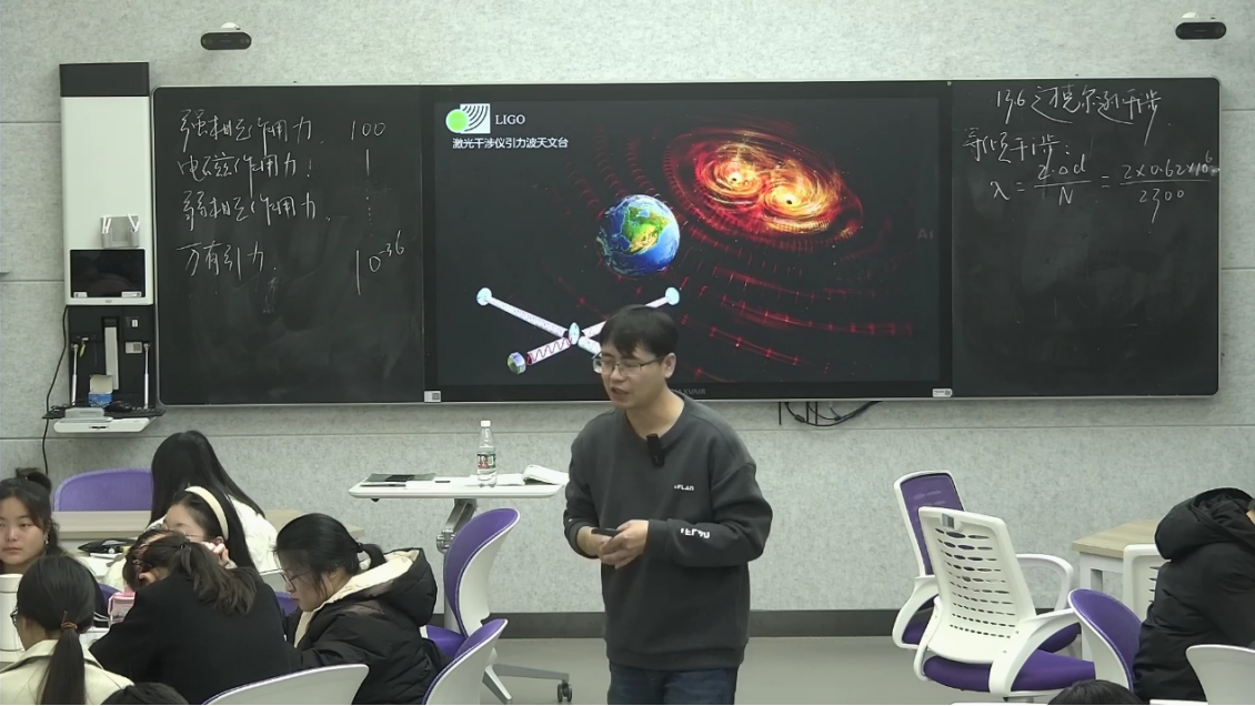 为了进一步推进和提升大学物理混合式教学,建设线下一流精品课程, 12月7日上午第2节课,物理教研室所有成员在孙金芳主任的带领下于博学楼(A3)N403智慧教室观摩了物理教研室成员倪程鹏老师的《大学物理(2)》的课堂,授课对象为人工智能2002班全体学生。 倪老师课件精美,有效调动了学生的视觉注意。首先,简单回顾了上节课的内容并应用分析了生活中常见的五彩斑斓的肥皂泡和眼镜反射彩色光的机理。在此基础上,引出新课:13.6节的“迈克尔逊干涉”。由于迈克尔逊干涉已经在物理仿真实验中操作过,因此,课堂上关于原理讲述的过程,会提出一些和实验课上不同操作的可行性分析,比如实验课上要求放置透镜,那么不放是否会出现干涉这样的问题。课件动画清晰地展示了实验的过程和原理,然后通过例题做了计算分析。接下来,延伸讲解了LIGO-激光干涉引力波天文台对引力波的测量,对比迈克尔逊干涉的原理简要分析了其探测原理,还结合了四大基本相互作用的强弱来解答学生的疑惑-“为什么测引力波这么困难”,把抽象的引力波干涉类比光电