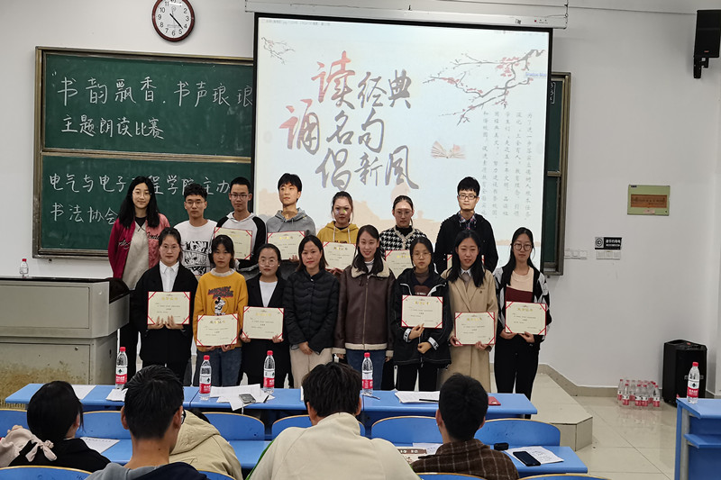 为进一步落实立德树人根本任务,深化“三全育人”教育理念,引领学生们“走进五千年文明、品读祖国经典美文”,养成爱读书、读好书的良好习惯,努力建设书香学院、和谐校园。2021年11月17日,由电气与电子工程学院主办,校书法协会承办的“书韵飘香,书声琅琅”主题朗读比赛活动在A1N206教室隆重举行,近百名师生参与活动。(图为朗读比赛现场)本次朗读比赛的评委由电气与电子工程学院的梅志慧老师、鲁孟老师、黄世彤老师担任。比赛现场气氛热烈,同学们热情高涨,各位同学都以认真的态度朗读出了发自内心的话语。他们的朗读声有的苍劲有力,有的清丽隽秀,有的辗转起伏,充分展现了各位参赛者比赛的热情,同学们的热情让这个寒冷的下午充满暖意,整个教室都散发着浓浓的朗读声。他们以饱满的激情、激昂的语言、大方得体的举止来展现自己的实力,把对党和祖国的感情表达的淋淋尽致。选手们饱含深情、入情入境地朗读,一次次赢得了在场评委和同学们的热烈掌声,评委们依据各位选手朗诵基本功、音乐选择、现场表现力及表现形式等多项标准进行量化打分,经
