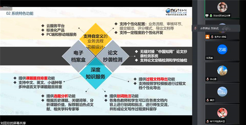 为进一步加强我校2022届本科毕业设计(论文)(以下简称毕业设计)过程管理,提高毕业设计质量,10月26日教务处组织开展中国知网大学生毕业设计(论文)管理系统培训,培训采用线上视频会议,各学院分管教学院长、教研室负责人、教学秘书、教务员、部分毕业设计指导教师、教务处及教育质量与评估办公室相关人员、部分教学督导、知网刘亚欣老师共199人参加培训。会议由教务处孙怡川主持。(毕设系统培训参会成员及流程介绍)培训流程分为三部分,首先孙怡川简要介绍了毕业设计管理系统概况和优势,我校自2022届本科毕业设计起,全面启用“中国知网大学生毕业设计(论文)管理系统”,要求各学院教学管理人员、毕业设计指导教师认真学习,尽快熟悉新系统;同时孙怡川强调了2022届本科毕业设计工作细节,要求各学院根据学校通知要求,有序开展2022届毕业设计组织工作。其次知网刘亚欣老师对毕业设计管理系统进行系统的培训,逐一介绍了教学管理人员、指导教师、评阅教师、督导专家、第二导师等角色功能,并详细演示了选题、开题、过程管理、评阅、