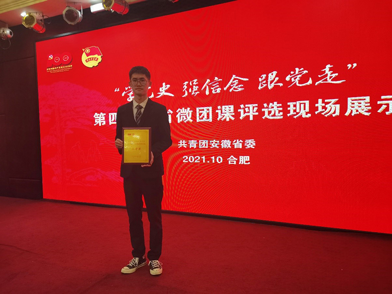 本网讯 为深入学习宣传贯彻习近平新时代中国特色社会主义思想和习近平总书记考察清华大学时重要讲话精神,扎实推进党史学习教育深入发展,10月25日,“学党史 强信念 跟党走”第四届全省微团课现场评选活动在合肥举行,来自全省各级团组织负责人和微团课主讲人等90余人进行了现场展示和介绍。大赛自5月份启动以来,得到了学校共青团干部、青年团员的积极响应。学校高度重视本次评选活动,组织参赛选手认真撰写团课讲稿并设计课件,最终推选2组作品代表学校参赛。经过专家初评,作品《学团史,懂团识》从全省参赛作品中脱颖而出,入围第四届全省微团课评选活动现场展示名单。经专家现场评审,我校秦明同学主讲的《学团史,懂团识》主题微团课荣获第四届全省微团课评选三等奖。(图为秦明同学在活动现场参与颁奖)(图为我校荣获微团课评选活动三等奖奖牌)本次活动结束后,我校团委将持续引领团员青年学习借鉴各地微团课的好经验、好做法,在强化自身学习的同时,持续发挥好基层团组织的思想引领作用,带动团员青年讲好四史,推动党史学习教育在学校共青团中