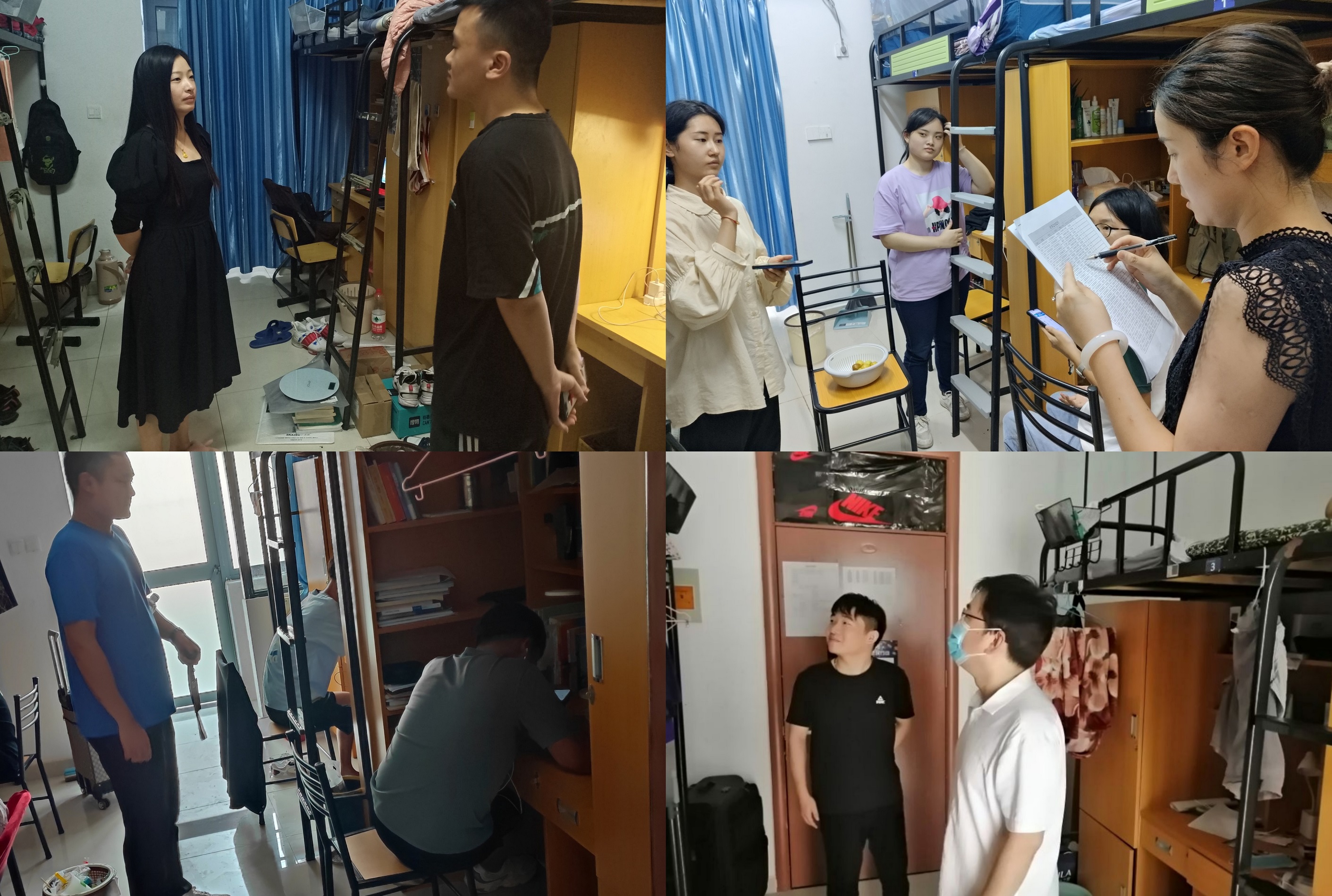 本网讯 为积极落实新时代劳动教育的主要使命,引导学生牢固确立劳动最光荣、劳动最崇高、劳动最伟大、劳动最美丽的劳动价值观,并进一步加强学生宿舍安全教育和管理,消除安全隐患,营造整洁宿舍环境,9月10日至16日,机械工程学院组织辅导员深入到学生宿舍进行全面检查。本次学生宿舍安全卫生检查重点围绕学生宿舍卫生、用电安全、使用违章电器、饲养宠物等情况开展,具有较强的针对性和目的性。老师们对学生宿舍认真巡查,细心检查所有可能发生的安全隐患,以查促改,防患未然。除此之外,老师们十分关心同学们开学后的学习生活状态,叮嘱同学们要调整状态重新投入到下一阶段的学习生活中。同时,提醒学生及时调整好生活作息及心理状态,快速适应新学期学习生活,并配合学校的防疫政策注重个人防护,及时上报相关信息。最后,鼓励学生在学好专业课程,保持良好的学业成绩的同时还应多参加社会实践活动及日常生活劳动,如宿舍、教室、教学楼的卫生清洁工作等,树立正确的劳动观。新生辅导员另外对宿舍内务情况进行指导检查,询问同学们学习生活方面的困难,并鼓