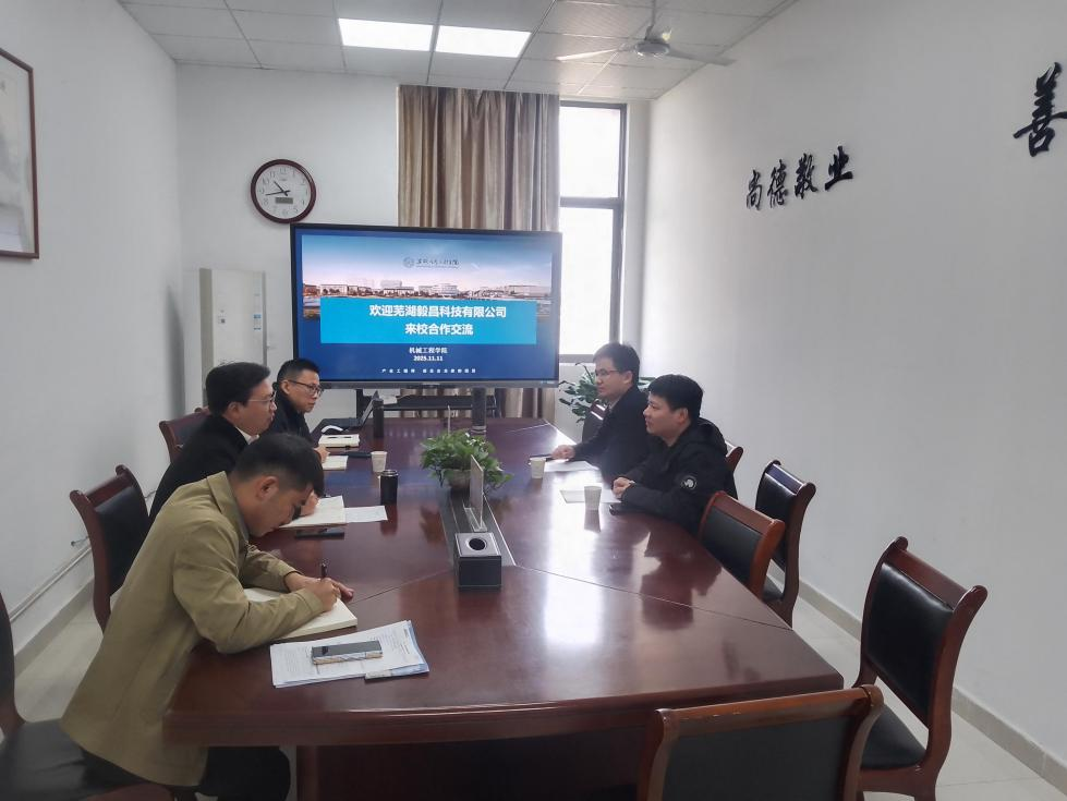 本网讯 为进一步深化校企合作,11月11日,芜湖毅昌科技有限公司汽车事业部技术总经理李能文、技术部部长张坤磊一行来校进行合作交流,机械工程学院副院长苗思忠及相关教师代表热情接待,双方举行专题座谈会。(图为座谈会现场)座谈上,李能文表示,高度认可学校的办学愿景和人才培养质量,期待通过共建实验室、毕业设计联合指导、实习就业、联合技术攻关等方式,实现资源共享、优势互补,推动科研成果转化,为企业创新发展注入新动能。同时他提出,希望借鉴学校在人才培养方面的做法,探讨构建企业员工的工程师培养体系,让企业员工的培养方案能够更具体,更符合企业实际情况。苗思忠对李能文一行的到访表示欢迎,他围绕学院学生实习就业情况、专业建设以及校企合作等方面进行了详细的介绍,并就工程师讲座、项目式实习基地等方面的典型做法作了进一步说明。双方围绕联合共建实验室2026年度建设方案、产学研合作模式、人才培养、毕业设计企业课题、实习就业等议题进行了深入交流。此次交流是继今年7月学院赴芜湖毅昌科技有限公司走访交流后,双方的又一次深