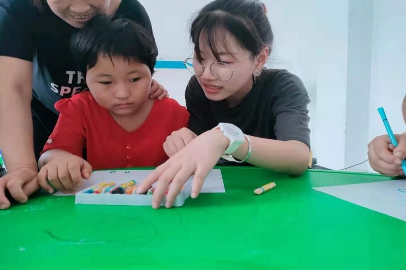 在这个世界上有着一些与众不同的存在,他们每一位都是降临在世间的折翼天使,他们的特殊需要社会的守护与关怀。在党的十九大报告中指出“要办好学前教育和特殊教育”,让每个孩子挺起胸膛,享受公平而有质量的教育。2021年7月22日至26日,来自管理工程学院国际经济与贸易1902团支部组成一支“心之所向队”开展了为期4天的走近残障儿童暑期社会实践活动。冒着炎炎的烈日,心之所向队的四位志愿者们(夏业芳、江婷、陈海容、许雨晴)来到了芜湖县残疾人康复中心。在这里我们见到了许许多多有着不同困难的儿童。在康复中心工作人员的讲解下,我们了解到学校主要分为智力有障碍的学生和听力有障碍的学生。对于智力障碍的学生,更多的是进行对应性残疾矫正与智力开发培养,以提高他们的生活自理能力和交际能力。对待听力障碍的孩子,最重要的就是耐心和爱心。他们的语言系统并不完善,对待外界的反应非常慢,所以在交流和教学方面需要给予他们更多地耐心。在工作人员的安排下,志愿者们先是陪伴小朋友们一起绘画,虽然他们在与人交往上有困难,但是他们每个人