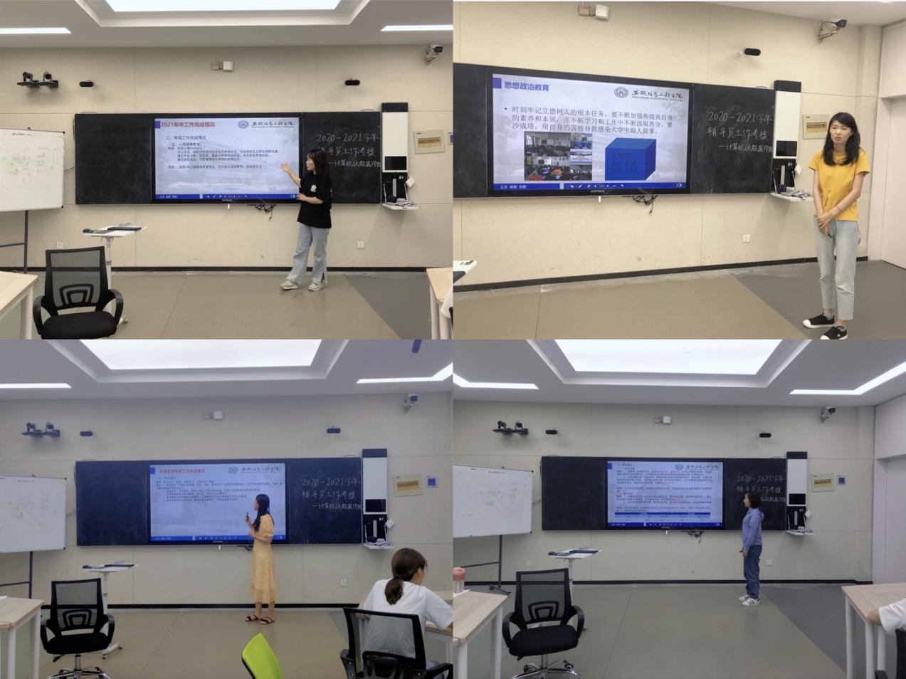 为加强辅导员职业素养,总结本学期学生工作情况,6月21日下午,计算机(大数据)学院全体辅导员在文津校区东一104教室进行了2020-2021年度述职汇报。副院长戴平、院长助理夏林、学工主管张文竹聆听本次述职汇报。(图为学院辅导员进行述职报告)本次述职辅导员们从本学期重点工作完成情况、常规工作完成情况、学生管理工作创新做法、问题与措施、未来工作计划等多个方面展开汇报。每位辅导员都对于上学期的工作进行了认真的总结,在学生思想教育、党团班级建设、学风建设、心理健康教育等多方面做出了育人成效。结合个人特色、班级特色,形成了独特的育人方式。(图为学院辅导员进行述职报告)本次辅导员述职完成后,两位新入职的小伙伴进行了自我介绍。对于新鲜血液的加入,我们满怀期待。随后,院长助理夏林对于本次的述职进行了分别点评,充分肯定了各位辅导员的工作。副院长戴平就本次述职发表讲话,她表示学生工作离不开辅导员的殷勤付出,大家在育人过程中不断成长,也会收获更好的自己。期待大家保持育人初心,坚守育人使命。(图为新入职辅导员