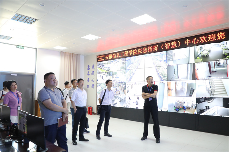 本网讯 基于战略合作框架协议,为调研智慧校园建设管理经验,深化落实合作,6月22日下午,中共芜湖市委党校(芜湖行政学院)校务委员、教育长胡沐,总务处处长董承智,总务处副处长郑世平,信息与图书资料中心副主任沈朴等一行7人来到我校调研考察。我校校长助理汪忠国、宋小秋,保卫处处长张祥,教务处副处长程玉林,智慧校园建设项目负责人卢平扬,后勤处科员杨靖榕等接待了考察团一行。考察团一行来到学校应急指挥(智慧中心),张祥围绕着校园安防平台的综合运用、校园门岗管理、后勤水电能耗管理和安防大数据建设运用等方面,结合校园建筑信息模型向来访一行详细介绍了我校智慧校园建设情况。(张祥作介绍)在智慧教室,程玉林向考察团详细介绍了学校智慧教室、智慧校园建设情况,展示了智慧教学的实际应用场景;杨靖榕介绍了学校后勤管理信息化建设情况,均得到了访客们的高度认可。(程玉林作介绍) (杨靖榕作介绍)参观结束后,双方来到图书馆二楼一号会议室座谈。座谈会上,汪忠国从建设背景、建设思路、建设现状等方面详细介