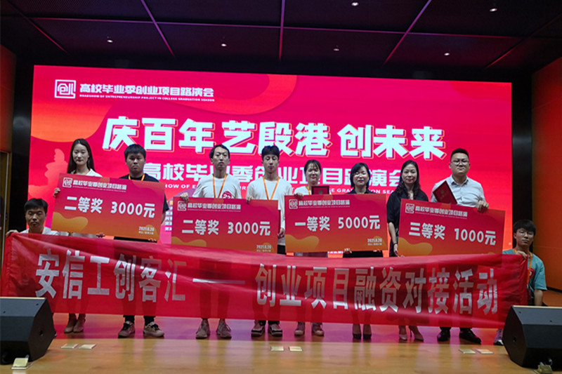 6月20日在芜湖市湾沚区六郎镇殷港艺创小镇顶峰1979文化创意园举办的“庆百年·艺殷港·创未来”高校毕业季创业项目路演会活动是由芜湖市新的社会阶层人士联谊会、芜湖市归国华侨联合会青年委员会、芜湖市青年企业家协会、芜湖市湾址区人力资源和社会保障局以及安徽殷港小镇投资有限公司主办,由安徽殷港文化创意有限公司和芜湖市湾沚区新的社会阶层人士联谊会承办的一场创业项目路演及投融资对接会。参加本次路演的有来自安徽师范大学等芜湖市7所高校的25个创业项目,其中我校参加路演的项目有5个,分别是:“渔你同行-推动大国渔业健康发展”、“绿源科技--循环外卖餐具领跑者”、“金车科技-一款新型SLA3D打印机”、“编丞相”以及“乐简单——可视化DIY程序设计系统”。(图为获奖项目合影)本次路演活动设置一等奖奖项1名,二等奖奖项2名,三等奖奖项3名,优秀奖奖项若干,我校参赛的5个创业项目均获奖,其中“渔你同行——推动大国渔业健康发展”项目荣获一等奖,奖金5000元;“绿源科技——循环外卖餐具领跑者”和“金车科技-一