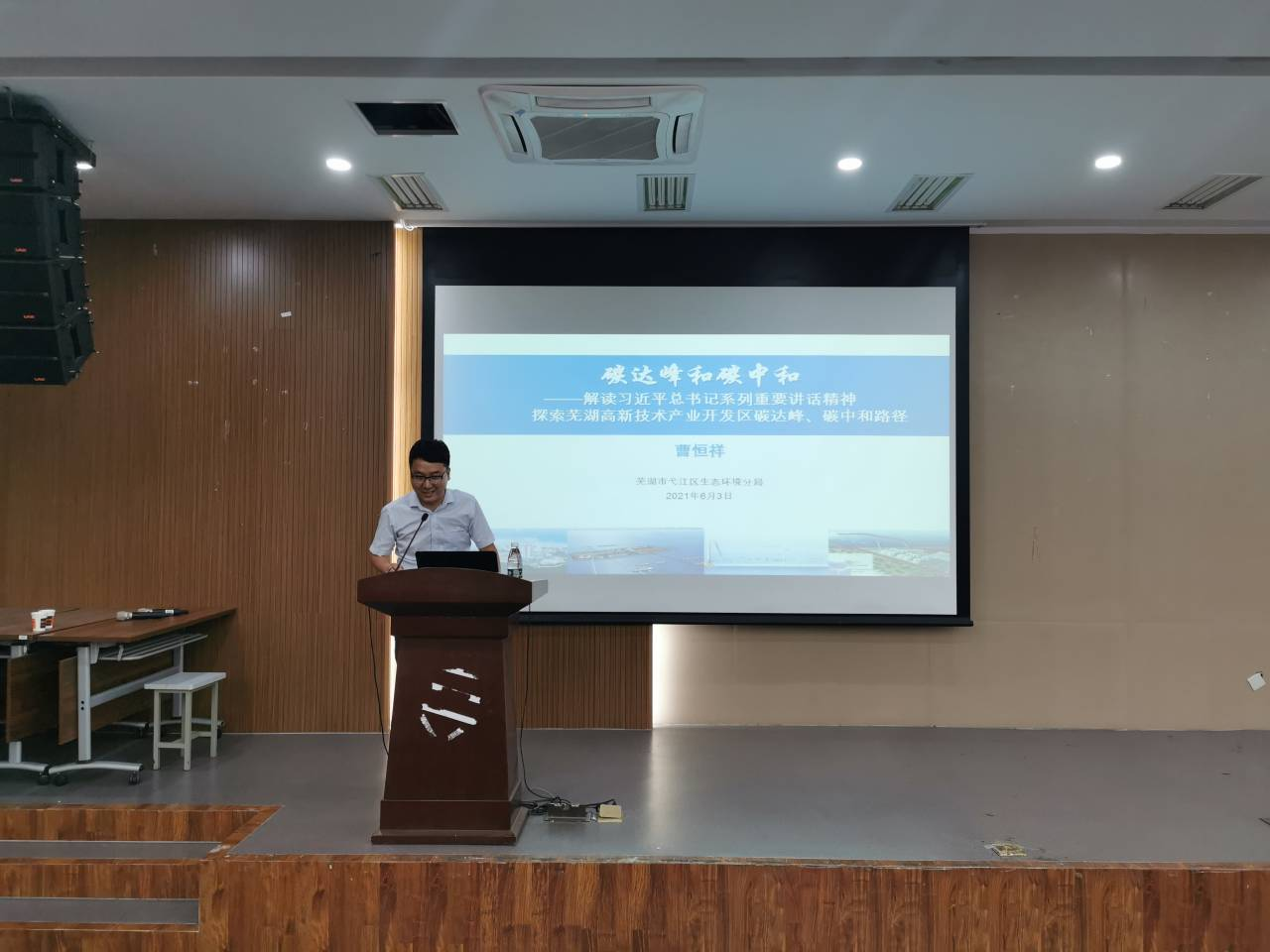 本网讯 为深入推进党史学习教育,扎实开展“我为群众办实事”实践活动,引导广大党团员干部践行初心使命。计算机(大数据)学院联合芜湖市弋江区生态环境分局于6月3日中午在文津校区东二503报告厅给同学们做了一场主题为“人与自然和谐共生”的讲座。本次讲座主要宣传和普及环保知识,倡导绿色低碳文明的生活方式,让同学们树立环保意识,从自身做起、从身边点滴做起,争做环保卫士,用实际行动为构建文明和谐校园贡献力量。本次讲座邀请芜湖市弋江区生态环境分局技术总工曹恒祥主讲,他主要从习近平总书记重要讲话精神,碳达峰和碳中和的重要意义以及园区绿色低碳循环发展路径三个方面来展开此次讲座。首先,曹恒祥讲到在第三届巴黎和平论坛会上,习近平总书记提出共同抗疫,共促复苏,共谋和平三条观点,同时表示绿色经济是人类发展的潮流,也是促进复苏的关键。中欧应共同坚持绿色发展理念,致力于落实应对气候变化。曹恒祥表示,习近平总书记重要讲话精神对于中国全面建成小康社会、夺取中国特色社会主义新胜利具有重大而又深远的意义。学习好贯彻好习近平总