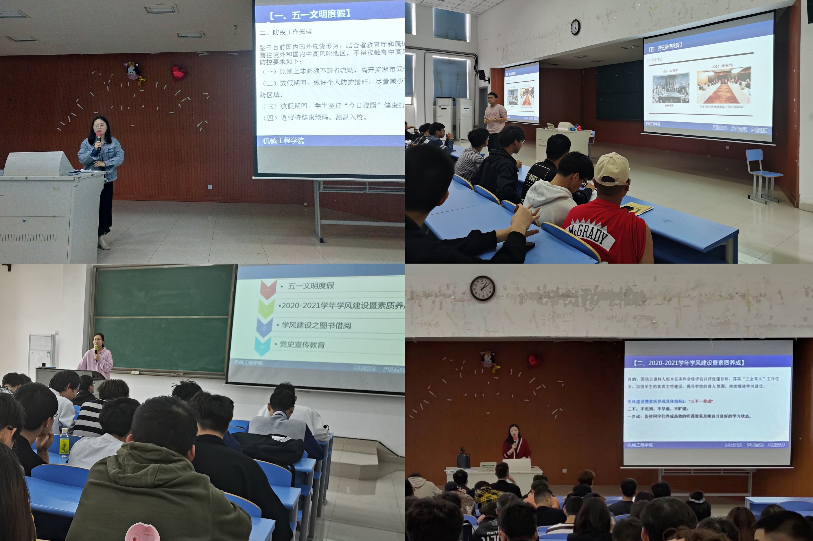 本网讯 4月20日至29日,机械工程学院各专业班级集中开展宿舍及假期安全、学风建设素质养成、文明校园创建暨“学史明志”党史学习教育系列主题教育活动。宿舍及假期安全联合教育行动为营造良好宿舍环境,落实宿舍检查常态化,学院学工组于4月20日开展宿舍安全突击检查,重点就宿舍卫生、用电安全以及防火、防盗设施等方面进行检查,对发现的问题及时提出,同学们主动积极整改。临近五·一,为提升学生假期安全意识,规避安全风险,学院全体辅导员在所带班级内开展五一假期安全教育主题班会,强调疫情防控要求以及常规安全注意事项。不断增强同学们自我防范、自我保护和处理突发问题的能力,防患于未然。学风建设素质养成及文明校园创建教育为深入贯彻落实《安徽信息工程学院2021年学风建设暨大学生素质养成计划实施方案》,针对学校近期关于狠抓校风、教风和学风等一系列工作部署,结合文明校园创建,学院全体辅导员在各班级开展学风建设素质养成及文明校园创建主题教育班会。主题班会围绕立德树人根本任务以及合格评估以评促建目标,落实“三全育人”工作