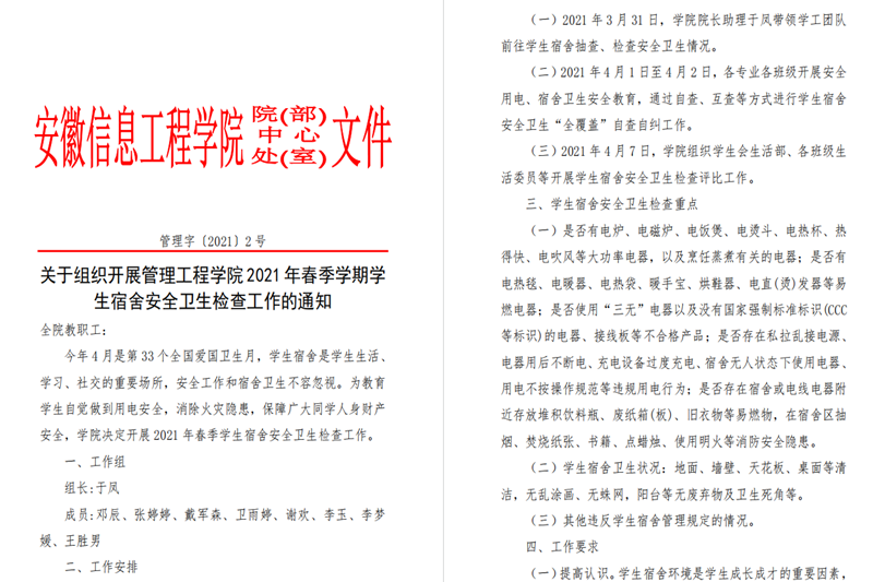 为了解新学期学生思想动态和学生在宿舍的安全、卫生、学习、生活等情况引导学生以积极状态投身新学期,管理工程学院组织学工团队通过学生宿舍走访、安全卫生检查等方式,分重点、分环节开展工作,与学生“面对面”交流,共话成长。 活动开展前,学院制定了《管理工程学院2021年春季学期学生宿舍安全卫生检查工作的方案》。(查寝工作方案) 按照工作方案,3月31日晚,院长助理于凤带领学工团队走进学生宿舍,开展春季学生宿舍安全卫生检查工作。走访过程中,大家认真了解学生在日常学习、生活、学生工作等方面遇到的困难,提醒学生要严格遵守校规校纪,做好宿舍个人卫生,特别提醒学生在疫情常态化防护情况下,要做好日常体温检测、健康防护、晚点名相关工作。勉励学生要珍惜与室友、同学相处的大学时光,要尽快调整好自己的状态,加强体育锻炼,以良好的状态,全身心投入到学习、生活中去,不断提升自己的专业素养与综合能力,在新学期实现新成长。(于凤布置工作任务)(于凤与学生交流学习生活情况)(了解学生学习情况)(图/左梦雨 文/刘若彤