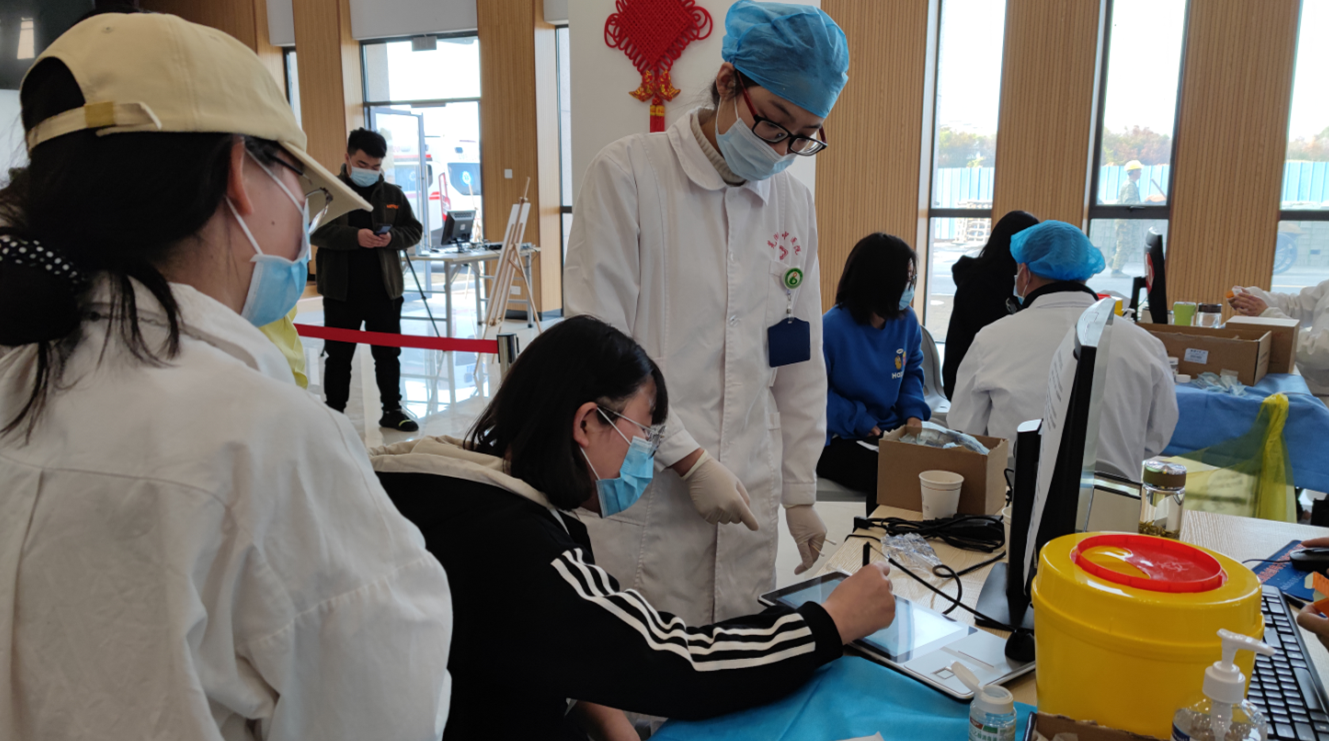 为加快推进新冠疫情防控工作,安徽信息工程学院开展了新冠疫苗接种工作。2021年3月24日,通识教育与外国语学院学生于新芜校区大学生活动中心集中接种疫苗。3月24日上午8:30,根据学校统一安排,通识教育与外国学院2017级毕业班在校同学为全校接种疫苗的首批学生,同学们在辅导员的陪同下来到接种点,经过医护人员的健康询问、知情告知之后,学生开始有序地进行疫苗接种。刘炎同学有幸成为全校第一位接种新冠疫苗的学生,在接种完疫苗后,刘炎感慨道:“听说学校集中组织安排疫苗接种,我并没有感到害怕,我是第一个报名接种疫苗的,接种时没感觉到疼痛,而且接种很快,接种后也没有任何反应,作为当代大学生,我们应该率先为国家全民免疫做出自己的贡献。”同学依次登记、接种,现场尽然有序。留观时,医护人向同学们强调了接种疫苗后的相关注意事项。学工秘书华静老师、团总支书记涂遥老师和辅导员余赟老师现场全程陪同,协助组织,直到最后一个学生安全离开接种现场。(学生在医生指导下登记签字)(通识学子疫苗接种现场)当前,全球新冠疫情仍在