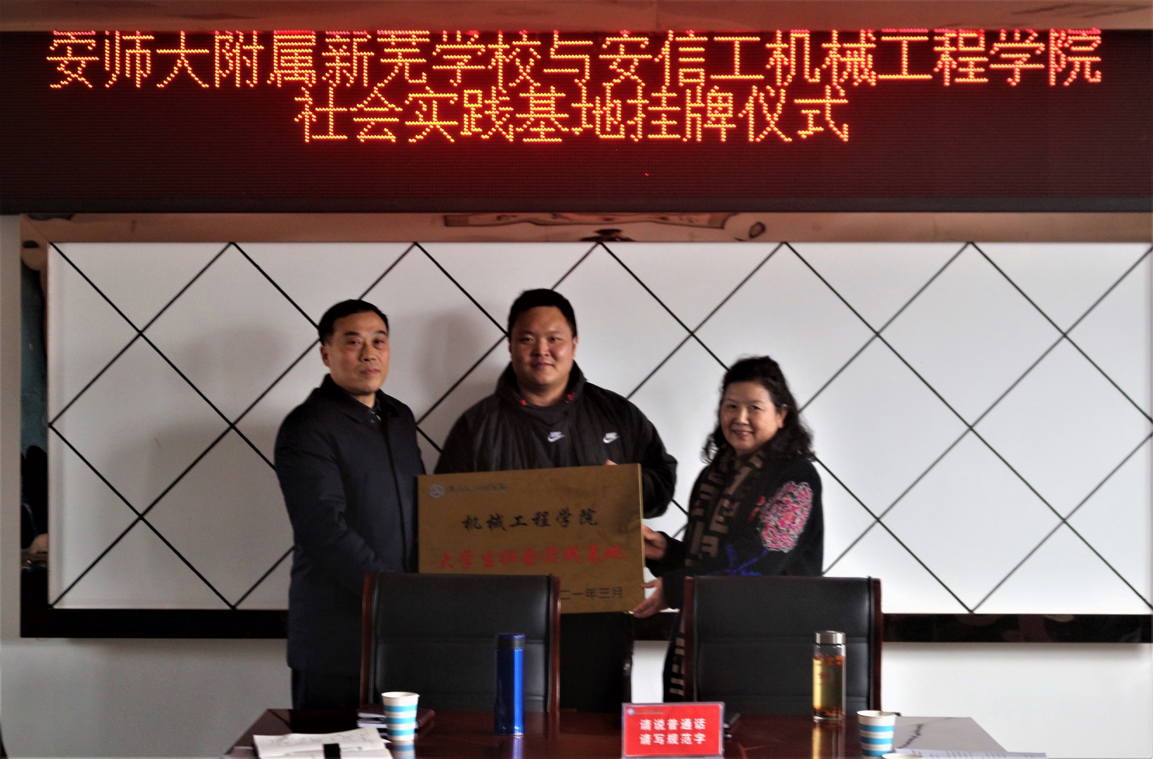 本网讯 2021年3月17日下午,安徽师范大学附属新芜学校与机械工程学院“社会实践基地”挂牌仪式暨“科技进校园”社会实践项目启动仪式在安师大附属新芜学校举行。安师大附属新芜学校校长李志华、校长助理孙梅、德育处主任李俊、少先大队辅导员汪晨燕,机械工程学院院长助理樊钒、学工秘书韩海东、团总支书记张梦蝶出席仪式。学院47名志愿者参加仪式并于仪式后开展首次社会实践活动。