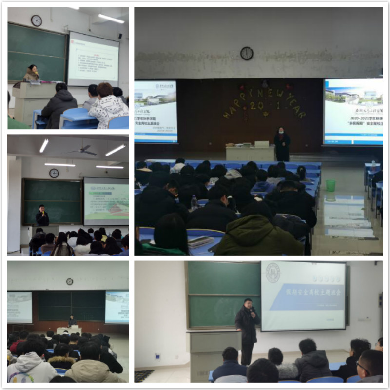 2021年元旦以来,随着我国一些省份多点出现新冠疫情,防疫形势越发复杂。自1月10日以来,电气与电子工程学院严格贯彻学校各部门《关于调整学生寒假放假时间的通知》、《关于做好寒假及春节期间校园安全保卫工作的通知》等文件精神,以主题班会、走访宿舍等多种举措,进一步做好寒假期间校园疫情防控、校园安全、学生安全返乡等各项工作。一、安全离校,强调防疫。年味踏着凛冬飘散而来,学子们归乡之情蠢蠢欲动。为了积极引导学生返乡途中提高疫情防护与安全防范的意识,在各专业年级放假前,全院各年级辅导员通过“寒假安全离校”的主题班会的形式,着重提醒学生们离校前做好宿舍用电、饮食安全以及离校途中的乘车安全、疫情防护等。班会中,各年级辅导员从人身安全和财物安全两方面展开论述,并将安全知识落实到具体事例中。在人身安全方面,要求同学们不仅要做到安全出行,重点关注防疫要求,乘坐正规车辆,还要尽量避免去地势险恶的地方。在财物安全方面,辅导员提醒广大同学们,要谨防网络非法金融诈骗,避免财产损失就寒假社会实践活动的注意事项作了简单