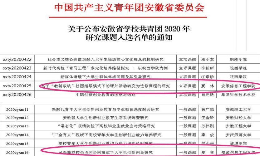本网讯 2020年11月,团省委学校部、省学校共青团研究中心、省青年大学生创新创业能力培养工作研究发展中心联合开展安徽省学校共青团2020年研究课题申报工作。我校积极参与申报,首次成功入选两项课题。 (图为研究课题入选名单通知)评审专家委员会在申报的144项课题中评审出相关立项课题。其中有安徽省高校共青团研究中心委托课题2项、重点课题8项、一般课题16项、立项课题29项。安徽省青年大学生创新创业能力培养工作研究发展中心委托课题2项、重点课题5项、一般课题9项。我校入选的两项研究课题,夏林老师的《基于“教辅双轨”社团指导模式下的课外活动转变为选修课程的研究》与《民办高校校企协同协同模式下大学生创新创业研究》,分别被列入“2020 年安徽省学校共青团研究中心入选课题名单”与“2020 年安徽省青年大学生创新创业能力培养工作研究发展中心入选课题名单”。(图为夏林老师)按照各课题组相关要求,我校在入选本次研究课题后定会高质量地完成研究任务,基于习近平新时代中国特色社会主义思想和党的十九大精神,贯