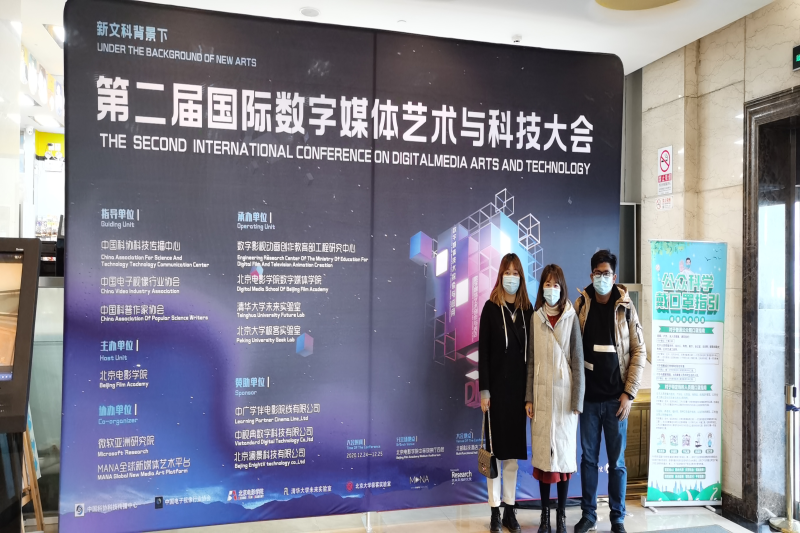 2020年12月24日,我校艺术设计学院数字媒体技术教研室负责人段俐敏、动画专业教研室负责人陈倪、专业教师张超参加了由北京电影学院主办的第二届国际数字媒体艺术与科技大会,50余位来自国内及美、加、韩、澳等国外的跨界跨学科专家学者、业内精英,围绕数字媒体艺术创作与表达、数字媒体领域的艺术与科技发展展开深入探讨。开幕式上,大会主席、北京电影学院副校长孙立军指出,新时代呼唤“新文科”建设,要“在文科教育创新发展的总思路下,以特色优势专业为内核,将新理论、新技术与新实践充分融合,扎实培养好新时代文科人才”。(第二届国际数字媒体艺术与科技大会会场合影) 在“数字媒体专业建设与人才培养”版块,与会嘉宾从数字媒体专业的人才教育、专业实践等角度发言表示,要搭建起中国数字媒体艺术专业产学研共享平台,促进数字媒体艺术专业的全球化发展与数字媒体专业人才培养模式的创新研究。12月25日,嘉宾还就“数字媒体艺术创作与产业融合”“数字媒体技术创新与理论突破”两个主题展开交流,共同探讨数字媒体领域理论发展、数字媒体技