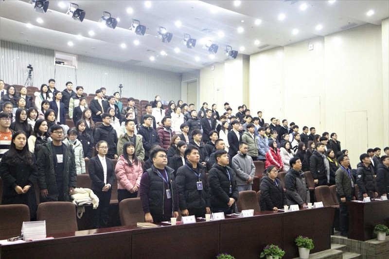 本网讯 2020年12月10日,安徽信息工程学员第十七期党课教育培训班结业典礼在新芜校区图书馆一楼报告厅顺利举行,安徽信息工程学院党委副书记、党校校长葛付才、校党委学工部部长吴晓、党建群团中心主任助理赵靓、各学院学生党支部书记、老师以及本期党校学员共同参与了此次典礼,文津校区学员同步线上直播进行。会议伊始,由主持人王甜向在场学员们介绍了莅临典礼的各位领导和老师,随后,全体学员们起立奏唱《中华人民共和国国歌》,典礼在庄严肃穆的国歌声中拉开帷幕。(图为学员们集体奏唱国歌)接下来,主持人宣读第十七期党课班结业情况和优秀学员名单,由发展对象优秀学员代表丁锋上台发表学习感想,并向我们详细说明了他在党课学习前后自己的心路历程,党课的学习使他端正了入党动机,也坚定了理想信念,他鼓励大家积极地参加社会实践,在实践中放飞自己的青春梦想。(图为优秀学员丁锋上台发言)随后,校党委副书记、党校校长葛付才发表讲话,他对十七期党课培训过程和学员学习结果表示了肯定,向顺利结业的积极分子和发展对象表示了诚挚的祝贺,同时