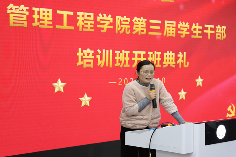 学生干部是高校实施教育管理工作的一只重要力量,是师生之间进行沟通交流的桥梁和纽带,管理工程学院“精英摇篮”学生干部培训班已经成功举办两届,成果显著,收到校、院领导、老师的表扬与肯定。为了继续深入贯彻落实好我校三风建设的要求,推进我院大学生素质养成计划的实施,增强学生干部自我定位、个人素质与业务能力,助力我校“双一流”建设工作,管理工程学院于12月10日中午在A3W301教室举行第三届“精英摇篮”学生会干部培训班开班典礼。参加开班典礼的有管理工程学院院长助理于凤,学工秘书邓辰以及各年级辅导员老师们,参训学员包括2020级各班班委和院学生会新一届委员。 在热烈掌声中,开班典礼拉开了帷幕,会议由邓辰主持。首先他表达了举办学生干部培训班的目的和意义,同时介绍了莅临指导的领导和老师们。接着,议程第二项,全体起立奏唱国歌。议程第三项,学生干部代表工商管理2001班李一鸣同学代表全体参训学员发言,他从自身出发,讲述了自己作为班干部的成长历程,向大家分享了自己一路走来的感悟,并代表全体培训班学