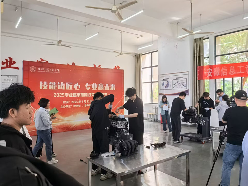 本网讯 为深化产教融合、弘扬工匠精神,进一步强化学生专业核心能力培养,学校于4月21日-27日举办以"技能铸匠心,专业迎未来"为主题的专业基本技能过关周活动。活动通过校企协同、赛训结合的形式,构建起"基础技能+创新实践+职业体验"三位一体的育人平台。教务处副处长程玉林主持开幕式并与相关职能部门负责人共同深入活动现场,与师生共同见证技能成长的蓬勃力量。(开幕现场)作为传统赛事,第二届发动机拆装技能大赛,采用“企业真实故障场景”考核模式,选手需在90分钟内完成发动机拆解、重新组装。机械学院各专业老师负责全程评判,随时提问。最终,车辆2301班“对不队”队伍以破纪录的33分钟完成比赛,总分98.5分夺得桂冠。(活动现场)新增的奇瑞iCAR总部参观实践,让学生置身智能工厂,观摩新能源汽车生产线,与工程师就"一体化压铸工艺""智能驾驶系统"等前沿技术展开研讨,有效打通了理论教学与产业应用的"最后一公里"。聚焦"数字工匠"培养目标,打造计算机拆装大赛,装机过程中,需要参赛同学组装固定好CPU、内存条