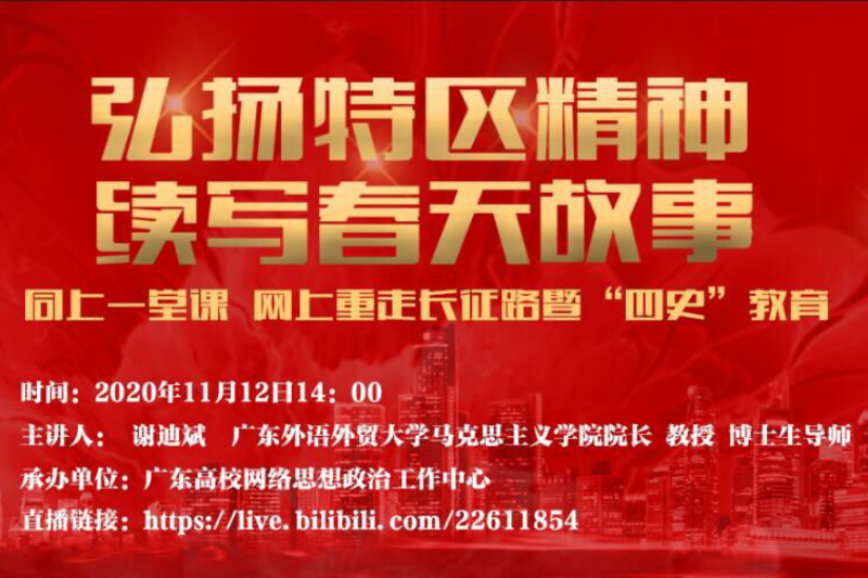 本网讯 为了深入学习习近平总书记在深圳特区建立40周年庆祝大会的讲话,弘扬敢闯敢试,敢为人先,埋头苦干的特区精神,引导我校学生了解先辈们筚路蓝缕,砥砺前行的创新开拓之路,2020年11月12日下午14:00,各学院团总支组织学生观看了以“弘扬特区精神,续写春天故事”为主题的直播课程。 (图为直播课程海报) 在本次直播课中,广东外语外贸大学马克思主义学院院士谢迪斌教授主要围绕经济特区的建立总结了成功的历史性经验和十个“始终坚持”。他讲述了深圳试错进取,持续解放和发展社会生产力,创造了一个又一个奇迹,由一个小渔村转变为国际化大都市。四十年同舟共济,四十年砥砺奋进,深圳特区永葆“闯”的精神,“创”的劲头,“干”的作风。同时,展望未来,紧扣“弘扬特区精神,续写春天故事”的主题,探讨特区应该如何继续深化改革,引导各高校师生培养敢于人先、敢于创新、敢于实践的精神,时刻保持逢山开路、遇水架桥的勇气,做新时代的引领者。 (图为学生集中学习课程) (图为各学院学生学习课程) 本次直播课程的学习,让广大学