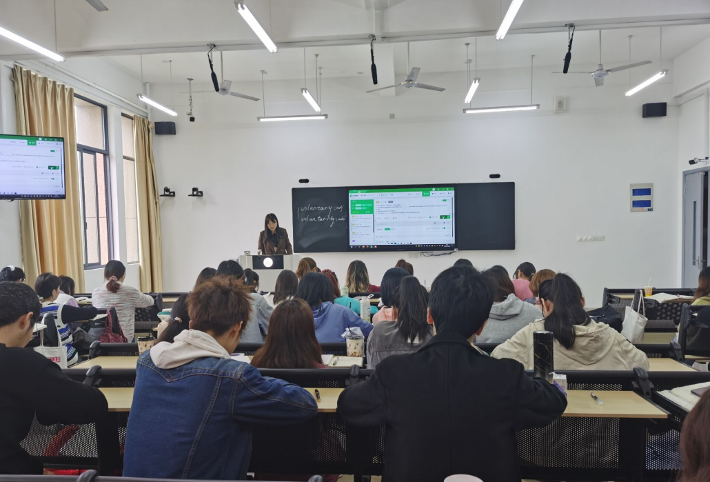 为了进一步提高新教师的专业素养和教学能力,夯实教师驾驭课堂教学的基本功,英语教研室在10月28日举行了宣云老师的综合英语3公开课教学活动。 通识学院副院长胡叶婷老师和英语教研室老师们,聆听了本次优秀课例。宣老师充分运用多种教学手段,运用科大讯飞研发的爱课堂平台进行提问和抢答环节,并通过发布即时课堂作业的形式,对学生所学知识进行检验和梳理,将新课程理念渗透到教学环节中,学生积极回答问题,课堂气氛活跃,取得了非常好的教学效果。通过本次公开课,新教师认真学习了优秀教师的教学经验。此次活动为新教师们搭建了一个观摩优秀教师上课、学习新的教学理念、运用学校的爱课堂等智慧教学工具的平台,使她们在教学方面得到了磨炼,对提高我校英语教师的教育教学水平起到很大的促进作用。(宣云老师公开课讲解)(文 唐静,图 唐静 ,核 黄飞,审 胡叶婷)