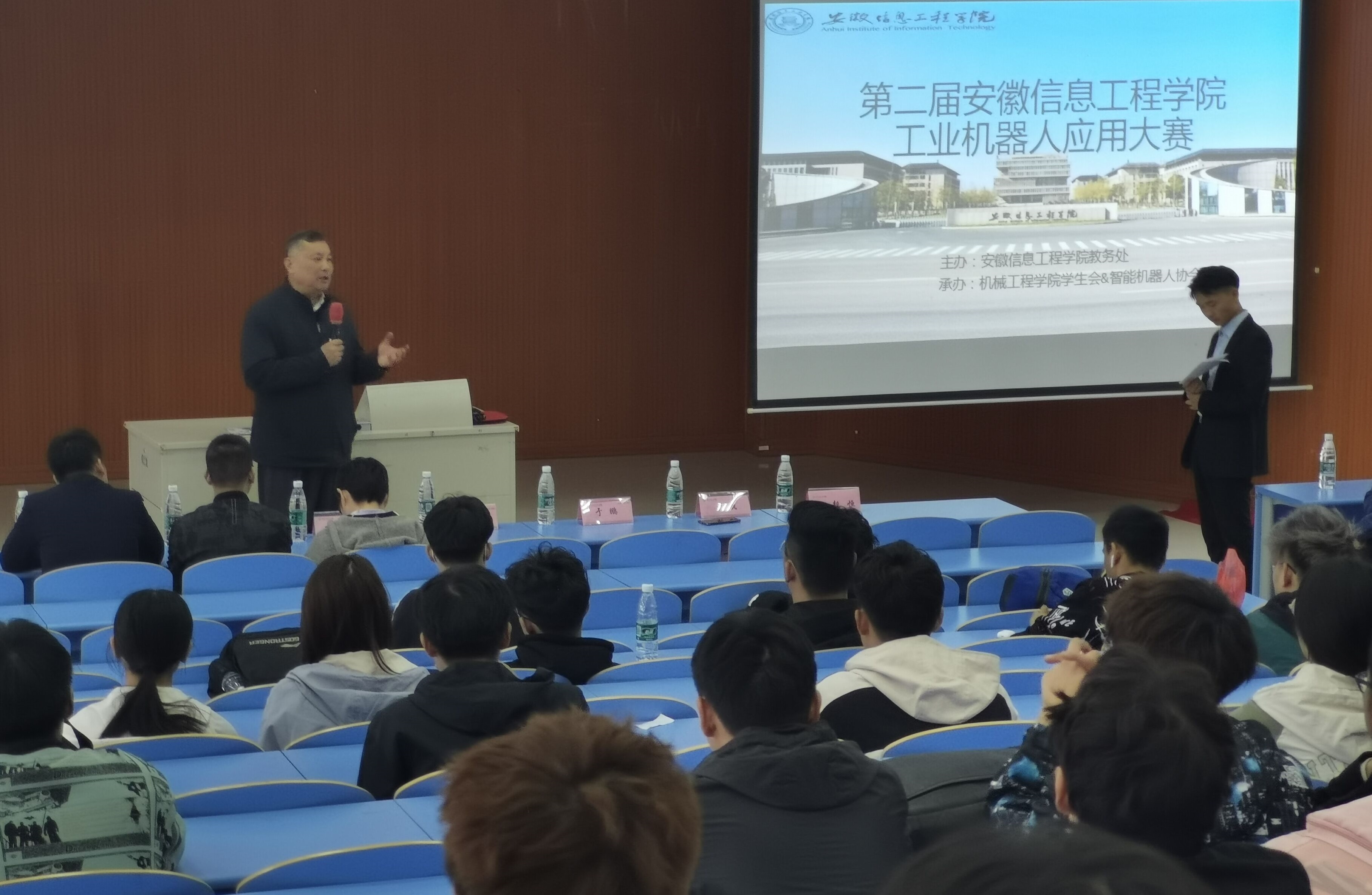 本网讯 为调动同学们学习专业技术的积极性,提高学生综合素质能力,由安徽信息工程学院教务处主办,机器人协会及机械工程学院学生委员会协办的第二届安徽信息工程学院“工业机器人应用大赛”,于2020年10月26日中午12:40在A1W101教室顺利举办。机械工程学院执行院长柴阜桐、院长助理于鹏、樊钒以及机械教研室胡汉春等多位指导老师出席比赛并担任评委。大赛开始由柴阜桐对本次比赛参赛选手进行鼓励和支持,并希望同学们能够利用自己的专业知识在比赛中获得优异的成绩,提高自己的综合实践能力,为机械工程学院创造佳绩。紧接着由主持人王润之宣布比赛的开始。只见参赛的同学们争分夺秒,一边的同学和小组成员激烈的讨论,另一边的同学已经在全神贯注的调试着机器,空气中充满着紧张的气息。时间一点一滴的过去,比赛也达到了尾声,同学们停下手中的动作,静候结果。最后热烈庆祝本次安徽信息工程学院第二届工业机器人应用大赛的圆满结束,通过本次比赛,不仅响应了学校大学生综合素质养成计划,而且使同学们敢于拼搏、敢于挑战,展示了机械工程学院