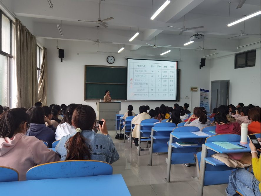 为了增强英语专业同学对本专业的了解,激发同学们的学习热情。通识教育与外国语学院于2020年10月14日下午2:00至3:30在新芜校区A1N202教室,面向2020级英语专业新生开展了“英语专业介绍会”,由英语专业教研室副主任陈蕾老师担任主讲,通识教育与外国语学院副院长胡叶婷老师出席了会议。(图为陈蕾老师在进行专业介绍)会议伊始,陈蕾老师从培养目标、培养模式、课程体系等几个方面简要地介绍了英语专业培养方案,使得同学们对整个四年的课程设置和学习内容有了较为清晰的了解和认识。随后,陈蕾老师介绍了英语专业的就业方向及前景,着重谈到了教育培训和外贸商务行业相关岗位的基本能力要求,提醒同学们设定清晰的学习目标,做好四年专业学习的规划安排。同时,陈蕾老师结合往届优秀毕业生的真实事例,从国内考研和国外留学两方面谈及了英语专业的继续教育问题,极大地鼓舞了现场的同学,增强了她们学好专业的信念。最后,陈蕾老师用一组寄语表达了对新生的期望。会议结束之前,副院长胡叶婷老师与新生进行了即兴交流。借着其长期的英语专