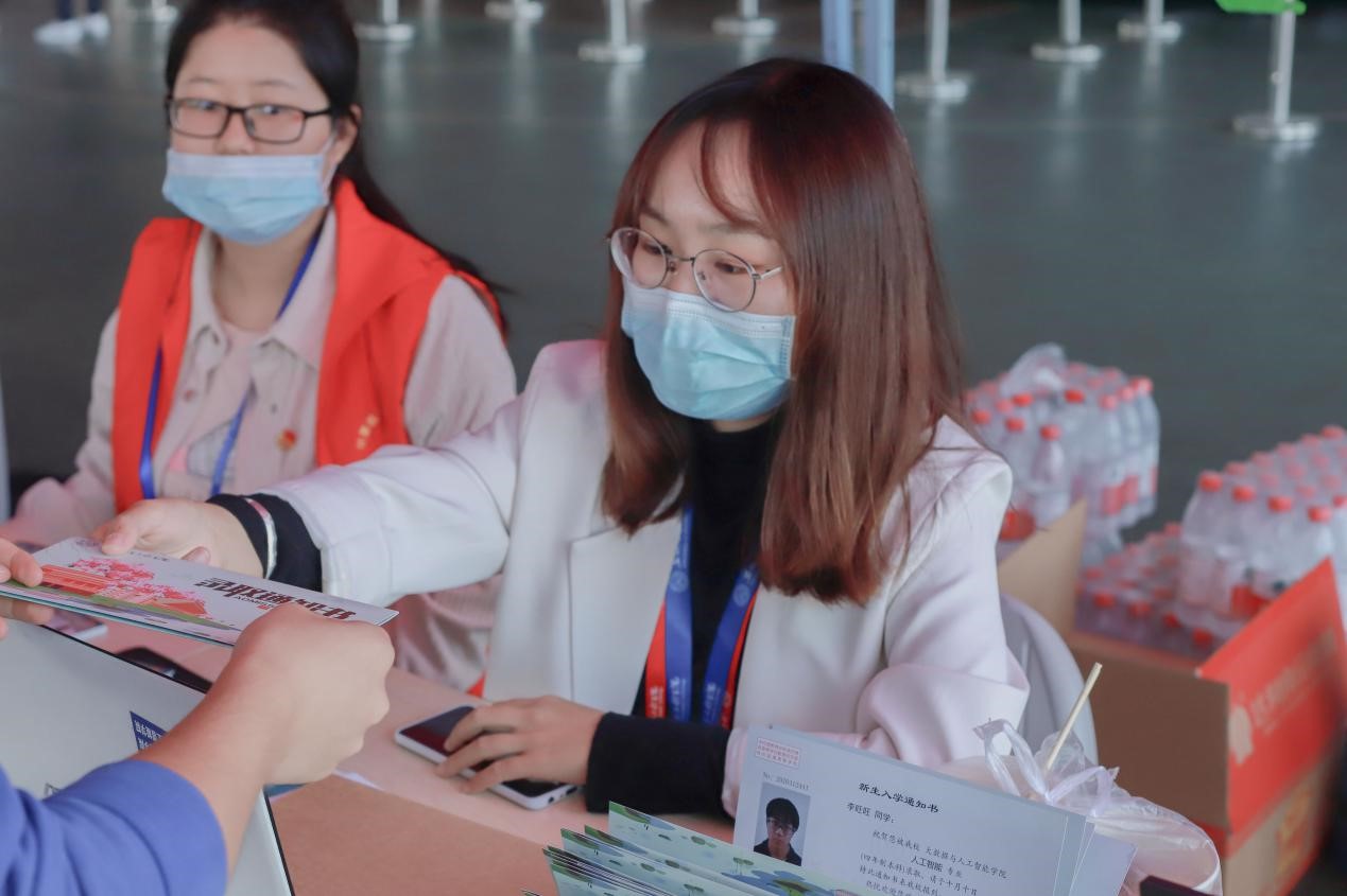 “疫”去花开,金秋十月,我们终于迎来了新的开始。10月9日上午,计算机学院2020级首位新生——赵静文同学在辅导员和志愿者们的帮助下顺利完成了入学报道手续。(图为计算机学院首位新生赵静文(右))“早上刚醒我便马不停蹄地赶来学校了!”赵静文同学十分激动的告诉记者。在谈及为何报考计算机专业时,她洋溢出浓厚的兴趣,表示自己从小就爱捣鼓电脑,喜欢看这方面的书籍,“计算机专业是本校的王牌专业,教学理念丰厚,教学设备完善,在网站上看到这方面信息后我便毫不犹豫报考了这个专业”。(图为媒体记者采访赵静文)在记者问到对大学生活的期待时,赵静文对我们腼腆一笑,眼里流露出满满的憧憬,“我想好好学习,做自己想做的事并结交一些新朋友,不给大学留下遗憾”。(图为辅导员为报道新生办理入学手续)迎新工作如火如荼地进行着,现场到处都是忙碌的身影,辅导员们认真的工作态度和志愿者们热情的微笑感染着每一位新生同学和家长。他们背着重重的行李、怀揣厚厚的梦想踏上求学的征途。这是新的起点,有更多的机遇和挑战,新主人必将以更加昂扬的斗