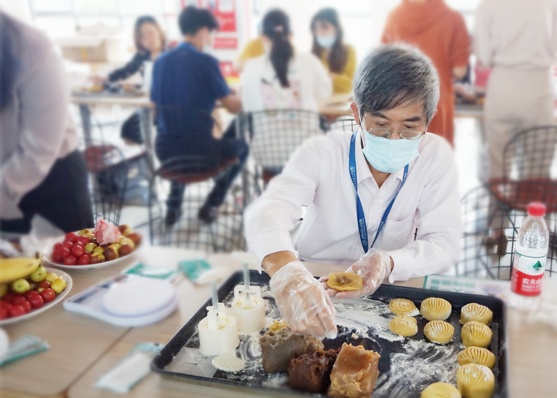 本网讯 今年中秋节恰逢国庆,双节齐至,为庆祝双节,丰富教工精神文化生活, 9月28日下午,校工会委员会在新芜校区陶然餐厅2楼组织举办了“情满双节庆华诞,月满信工共狂欢”主题烘焙DIY活动,此次活动由后勤管理处、招生就业处共同承办,武汉华工餐饮管理有限公司协办,学校近70名教职工参加了此次活动。 (图为活动现场)“来,大家看看我做的月饼”,活动现场,副校长王彬高兴地向大家展示他亲自制作的月饼,并向大家表达了校领导和校工会对在场教职工的节日祝福。围绕中秋佳节主题,本次活动主要制作广式月饼和曲奇饼干,活动邀请了专业烘焙师傅为大家讲解并现场演示了月饼等点心的制作全过程。(图为王彬副校长参与活动)月饼制作过程分为调馅儿、和面、揉面、包月饼、烤制、回油等环节,在培训师的指导下,经过两个小时的忙碌,伴随着满满的期待和扑鼻的香味,老师们的作品出炉了,大家互相欣赏成果、交流心得,并用精美的礼盒包装了自己的劳动成果,现场其乐融融,大家的脸上都洋溢着兴奋与满足的笑容。(图为活动现场老师们相互交流心得)(图为活