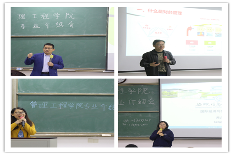 为了让20级新生更快地适应大学生活,更好地了解所学专业特色,规划自己的大学四年生活,管理工程学院于10月28日晚举办了财务管理、工商管理、国际经济与贸易、市场营销四个专业的新生专业介绍会,介绍了学生比较关心的学习,升学,就业等方面。各专业教研室主任、新生辅导员以及全体20级新生参加此次介绍会。四个专业的教研室负责人作为主讲人,从专业基本情况、大学四年发展规划和学生必备素质三方面进行了详细介绍。无论是钱玉霞向工商管理新生介绍的工商管理人才“三三制”培养模式,还是汪洋老师向财务管理新生提出的优秀财务人员的能力标签,亦或是曹长芳所总结的对于市场营销的同学来说创业者的身份态度和周文君老师强调的英语对于国际经济与贸易的重要性,无一不是老师们在精心准备后总结出的经验教训。(各教研室负责人进行讲解)大学是人生全新的起点,希望同学们认清自我、找准方向,在学习方面严格要求自己,生活上协调好各类事情,在四年的时间内多读书,增强自身的知识储备,提高自己的专业能力。 (图、文/左梦雨 核/邓辰 审/刘冰)