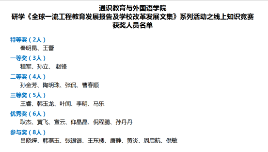 为加深我院教职工对学校近几年来的教育改革理念和举措与发展成效的全面了解和掌握,进一步了解全球一流工程教育发展现状和未来趋势,充分调动教职工研学《全球一流工程教育发展报告及学校改革发展文集》的积极性。通识教育与外国语学院于9月4日面向全院教职工开展《全球一流工程教育发展报告及学校改革发展文集》线上知识竞赛活动。本次竞赛借助讯飞爱课堂智慧学习工具,以在线答题的方式开展,共有28名教职工参加了此次竞赛。知识竞赛设置了单选题、多选题、简答题三种题型,内容覆盖了《全球一流工程教育发展报告及学校改革发展文集》的所有内容,具体涵盖“全球一流工程教育研究概括”、“世界一流工程教育项目”、“新兴引领者院校案例研究”、“新兴引领者院校案例研究”、“我校教育改革与发展理念和举措”等多个模块。经过激烈的角逐,最终产生特定奖2名、一等奖3名、二等奖4名、三等奖5名、优秀奖6名、参与奖8名。竞赛结束,参赛教职工们纷纷表示,通过此次知识竞赛,对于全球一流本科工程教育的发展现状及未来发展趋势有了更加深刻的认识和了解,对