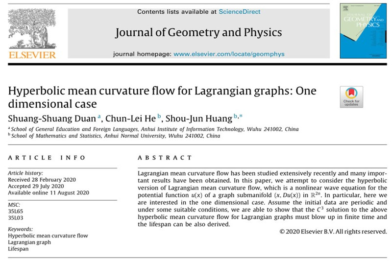 2020年8月11日,我校通识教育与外国语学院数学教研室段双双老师与合作者的最新研究成果《Hyperbolic mean curvature flow for Lagrangian graphs: One dimensional case》,发表在一类期刊《Journal of Geometry and Physics》。段双双老师为论文第一作者,安徽信息工程学院为论文的第一完成单位。这也是我校数学教师首次在该专业期刊上发表学术论文。 近年来,学术界对拉格朗日型平均曲率流进行了广泛深入的研究,并取得了许多重要的成果。该文讨论了拉格朗日型双曲平均曲率流在一维情形下的初值问题,假设初值是周期的且满足某些特定条件,得到上述方程的解将在有限时间内爆破,并给出了生命区间。该文在一定意义上推进了偏微分方程在微分几何上的具体应用。 长期以来,通识教育与外国语学院高度重视教师科研工作,不断营造良好的科研氛围,促进教师科研能力的成长,教师发表的学术论文质量也逐年提升。(论文截图)(文、图/段双双