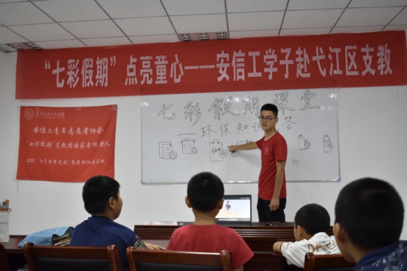 本网讯 为践行习近平总书记在党的十九大报告中提出的“必须树立和践行绿水青山就是金山银山”的理念,引导青少年树立节约资源和保护环境的意识,安徽信息工程学院青年志愿者协会“七彩假期”支教团芜湖小分队于2020年8月10日至弋江区马塘镇元山义务支教班,开展了以“坚持节约资源,保护自然环境”为主题的支教活动。 (图为志愿者为孩子们讲述环保知识) (图为志愿者自己动手制作垃圾分类课堂道具)10日上午,志愿者们开展了“光盘行动我知道”、“环保知识小课堂”、“垃圾分类‘新时尚’”等形式多样、生动活泼的主题教育课程。志愿者们结合当下“光盘行动”这一热点话题,向孩子们宣传“谁知盘中餐、粒粒皆辛苦”的节约理念,呼吁孩子们要避免“舌尖上的浪费”;在“环保知识小课堂”中,志愿者呼吁孩子们要尊重自然、爱护自然、做环保小卫士;在最后一堂“垃圾分类‘新时尚’”课堂中,志愿者结合“识”垃圾小游戏与孩子们展开互动,让孩子们在游戏中学会垃圾分类,同时增强节约资源的意识。 (图为志愿者带领孩子们实地学习垃圾分类知识) (图为