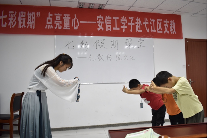 本网讯 为传承和弘扬中华优秀传统文化,引导学生树立和坚持正确的历史观、民族观、国家观、文化观,不断增强中华民族的归属感、认同感、尊严感、荣誉感,安徽信息工程学院青年志愿者协会“七彩假期”支教团芜湖小分队于2020年8月8日至9日,开展了以“礼敬传统文化”为主题的支教活动。本次主题活动涉及传统礼仪、书法艺术、孝道文化、民风民俗四个方面,近十名志愿者参与本次活动,带领孩子们感受中华优秀传统文化的魅力。 (图为团队成员邢婷君同学教授传统礼仪) 8月8日上午,志愿者邢婷君同学给孩子们上了一堂精彩的中华传统礼仪课。邢婷君同学身穿华美的汉服,给同学们讲述博大精深的中华礼仪文化,同时发出呼吁:“同学们,我们要通过学习中华优秀传统礼仪,做有修养、有素质、礼貌待人的新时代优秀少先队员。”在礼仪互动环节,同学们踊跃走上讲台与志愿者进行互动,一同学习拱手礼、趋礼等传统礼仪。(图为团队成员丁海龙同学指导孩子书法)8日下午的课程主题是书法艺术。志愿者们首先为同学们讲述了有关书法的相关知识,让孩子们更为直观的了解了