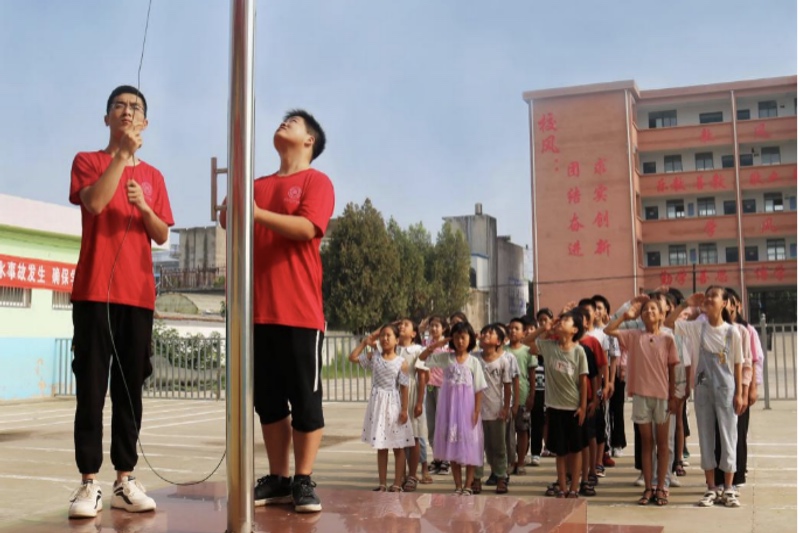 本网讯 为深入践行“奉献、友爱、互助、进步”的志愿服务精神,展现当代青年志愿者乐于奉献的青春风采和高度的社会责任感。安徽信息工程学院青年志愿者协会“七彩假期”支教团灵璧小分队在校团委指导下,于2020年8月10日来到宿州市灵璧县青茑教育基地,开展了以“爱国主义教育”为主题的支教活动。微风徐徐,童声飘扬。上午8时,志愿者带领孩子们排着整齐的队伍来到操场举行升旗仪式,孩子们面向国旗立正,向五星红旗行少先队礼,伴着庄严的国歌,五星红旗冉冉升起。“少年强则中国强、少年富则中国富”,此次升旗仪式,增强了同学们与志愿者的爱国情怀,激发了孩子们爱国、爱家、爱园的情感,在孩子们幼小的心灵里播撒下了爱国主义的种子。 (图为志愿者彭祥雨和葛茂宁带领孩子们举行升旗仪式)(图为孩子们列队向国旗敬礼)10日下午,团队开展了讲述抗疫英雄故事、缅怀民族英雄事迹、观赏爱国影片等一系列爱国主义教育活动,一个个抗疫英雄的事迹走入学生的生活,让学生进一步感悟逆行英雄的“苟利国家生死以,岂因祸福避趋之”的爱国精神,感悟他们“祖