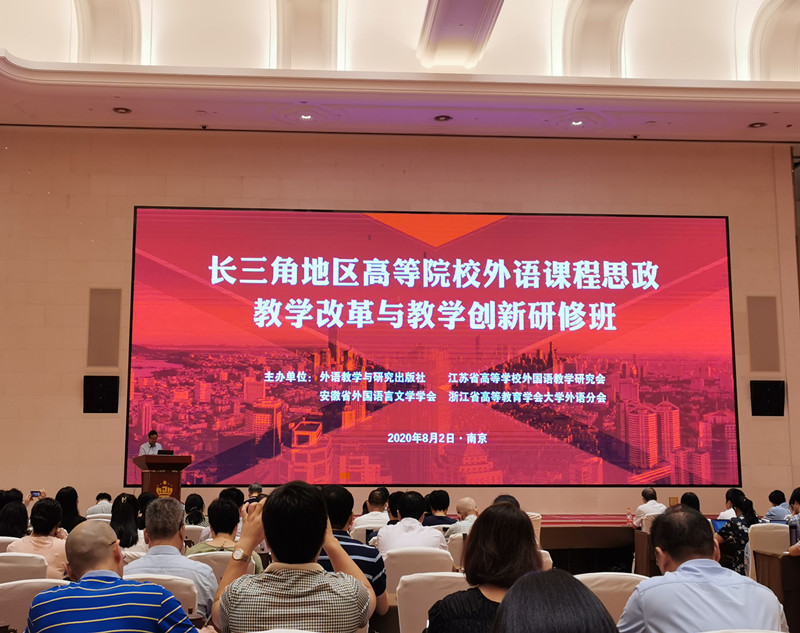 为深入贯彻落实习近平总书记关于教育的重要论述和全国高校思想政治工作会议精神,进一步推动外语课程与思政教育深度融合,提升高校外语教师思政素养和思政教学能力,外语教学与研究出版社、江苏省高等学校外国语教学研究会、安徽省外国语言文学学会、浙江省高等教育学会大学外语分会于 2020 年 8 月 2 日在南京举办了“长三角地区本科高校外语课程思政教学改革与教学创新研修班”,我院教师孙立参加了该研修班的学习与讨论。 为准确把握课程思政内涵,了解课程思政建设及思政教育与外语课程融合的重要意义,研修班邀请了江苏省教育厅高教处邵进处长、中医药大学原党委书记张智强教授、南京大学杨金才教授分别做了《江苏省高校课程思政建设的价值方向与实施路径》、《如何发掘高校课程中的思想政治教育资源》、《课程思政与新时代外语教育人才培养》的主题报告。 为了探讨将课程思政贯穿于外语教学设计与实践全过程的策略方法,构建外语教学全员全程全方位育人大格局的路径,研修班还邀请了南京师范大学田朝霞教授从《立德树人、知行合一——“英