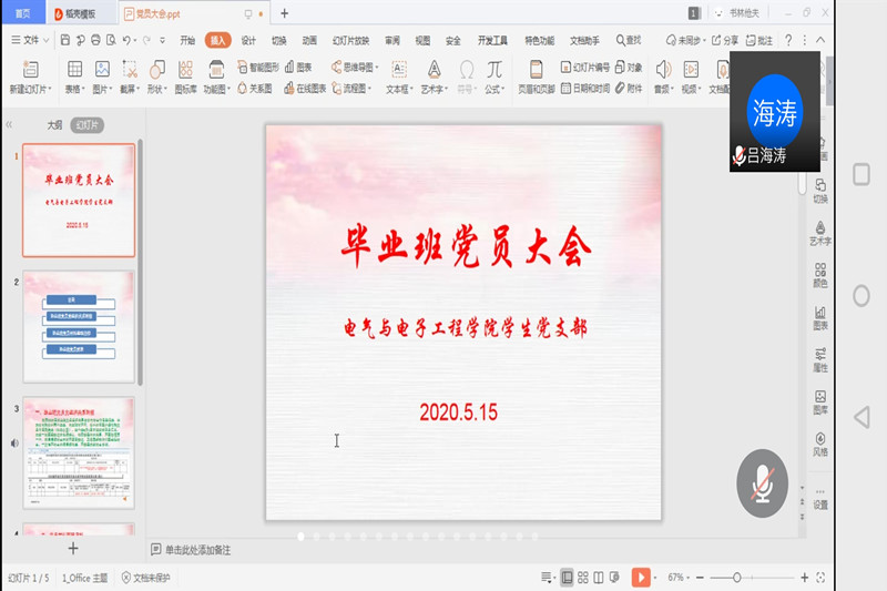 在2020届毕业生党员即将返校办理毕业前相关工作之际,为切实增强毕业生党员的党性修养,引导其在接下来返校日常管理工作和学习岗位上继续发挥先锋模范带头作用。5月15日18时,电气学院组织开展毕业生党员主题教育大会。2020届全体毕业生党员出席会议,会议由学生党支部书记吕海涛主持。会上,吕海涛对毕业生党员党组织关系转递事宜进行部署,并就党组织关系转接的重要性、具体政策和相关注意事项进行详细的解读,同时针对大家普遍存在的疑惑进行了解答。(毕业班党员主题会议)同时,党员主题教育大会还增设了毕业生党员的交流环节,全体毕业生党员同学纷纷发表感言,无不深深表达了对学院和老师的感恩之情,以及对母校发展的深切祝福。毕业生党员纷纷表示:在今后的日子里,定会严以律己,坚守信念,在思想上提高党的政治觉悟、在行动上践行党的政治信仰,定将为母校争光、为党争辉。吕海涛希望全体学生党员应时刻牢记党员身份、履行党员义务、做党章党规的自觉遵守者。在特殊时期更要强化意识形态底线思维,提高政治站位责任意识,积极主动作为,切实做