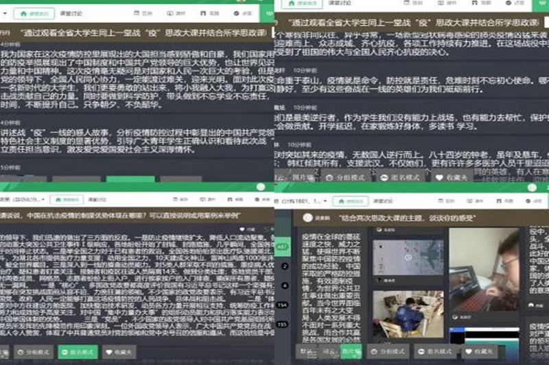 4月23日,中共安徽省委宣传部、中共安徽省教育工委、安徽省教育厅与人民网联合组织“同上一堂课战‘疫’思政大课”,为了使学生全面了解疫情情况,培养爱国主义精神,学院组织没有课程安排的学生线上观看讨论,并组织学生党支部和学生委员会召开专题讨论会议。同学们边看直播边展开讨论,发表自己的想法,大家都认为“同上一堂课战‘疫’思政大课”以直播的方式为高校师生打了一针共战疫情的“强心剂”,在这场战“疫”中,我们看到了中华民族的力量,透过一张张布满勒痕的脸、一把把为避免交叉感染的而剪了的发辫和一个个蜷缩在地上休息的身影,深刻体会到了国家在这场战“疫”中展现出强大的制度优势和全国各族人民众志成城的巨大力量。(班级、学生党支部、学生委员会分别观看讨论疫情防控思政大课)学生党支部和学生委员会在召开专题讨论会时表示这场疫情也让我们看到了中国共产党的力量,正是在中国共产党的领导下,广大党员勇挑重担,深入一线,切实展开疫情防控工作,在人民群众中发挥先锋模范作用,在疫情防控中发挥中流砥柱作用,使得全国上下有序进行抗击
